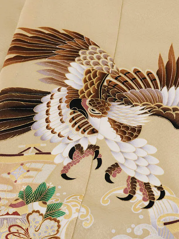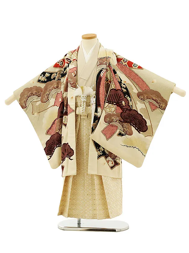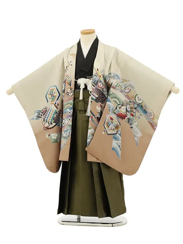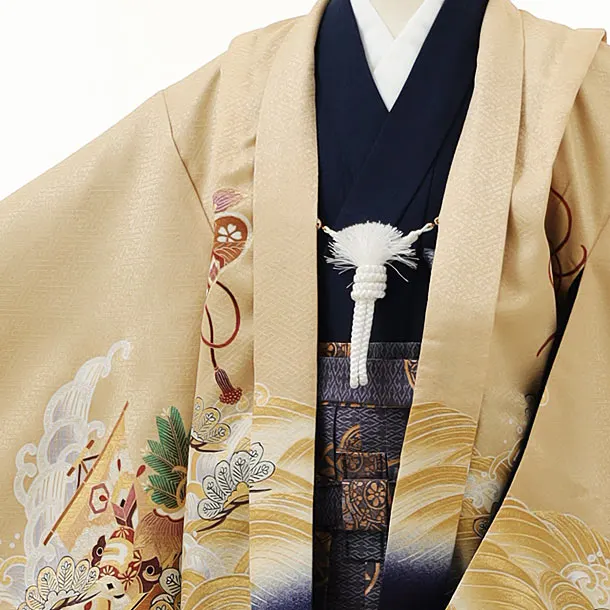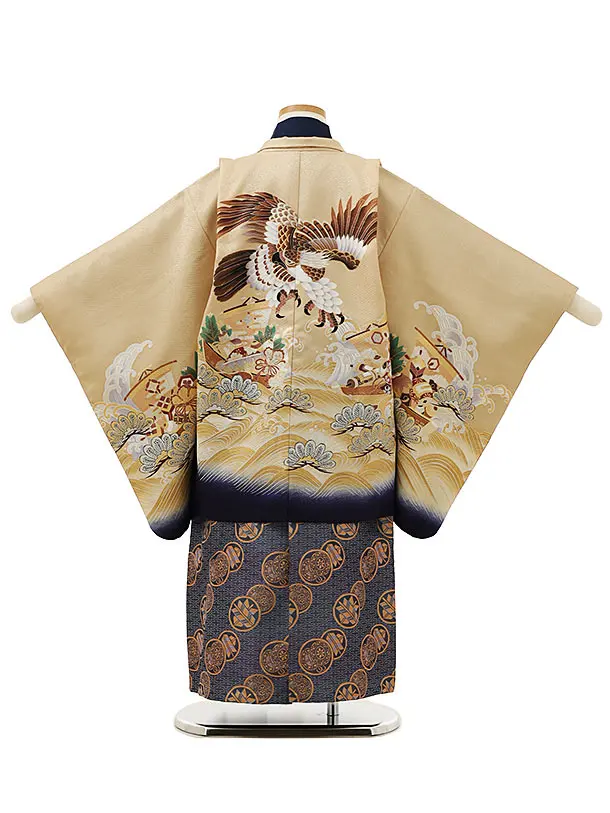 かんたん七五三レンタル(5歳男袴)X038ベージュ波に宝舟鷹x紺丸紋袴