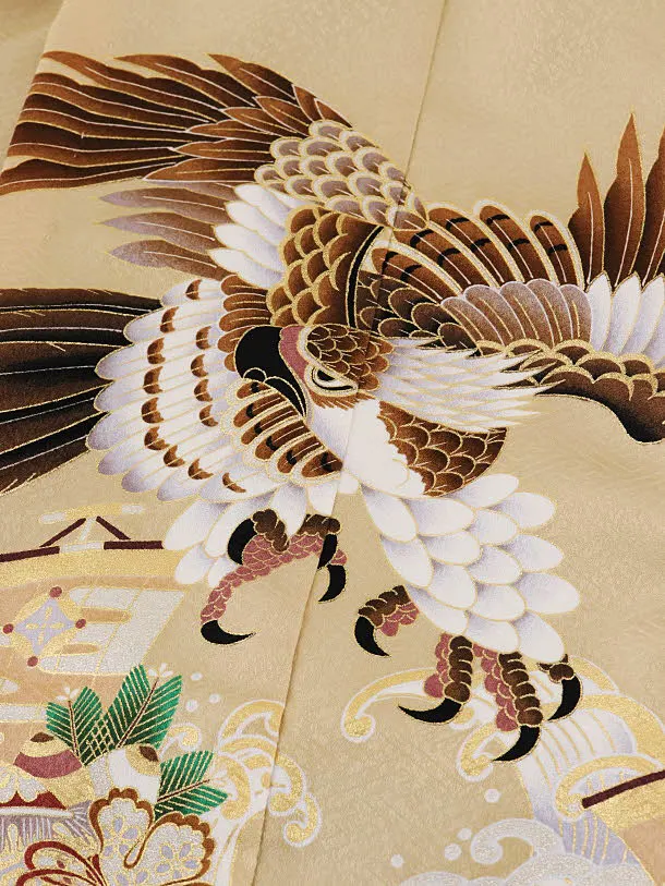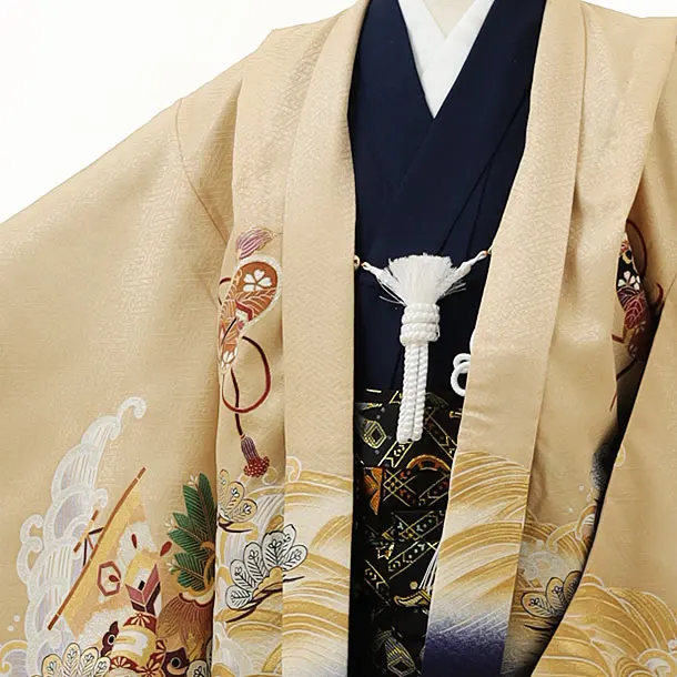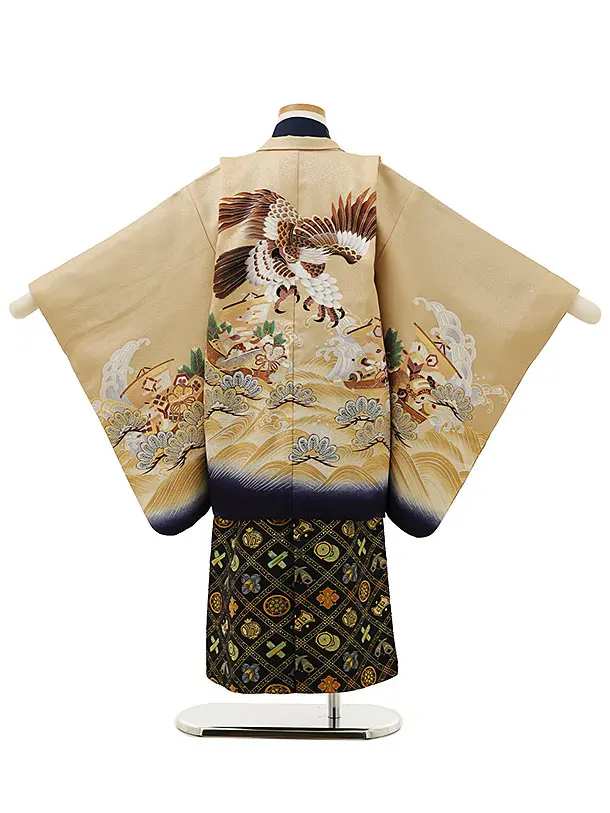 かんたん七五三レンタル(5歳男袴)X045ベージュ裾紺波に宝舟鷹x黒袴