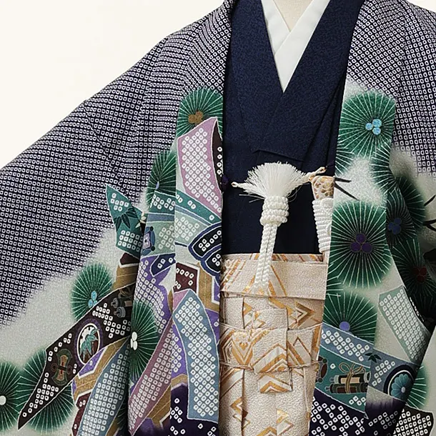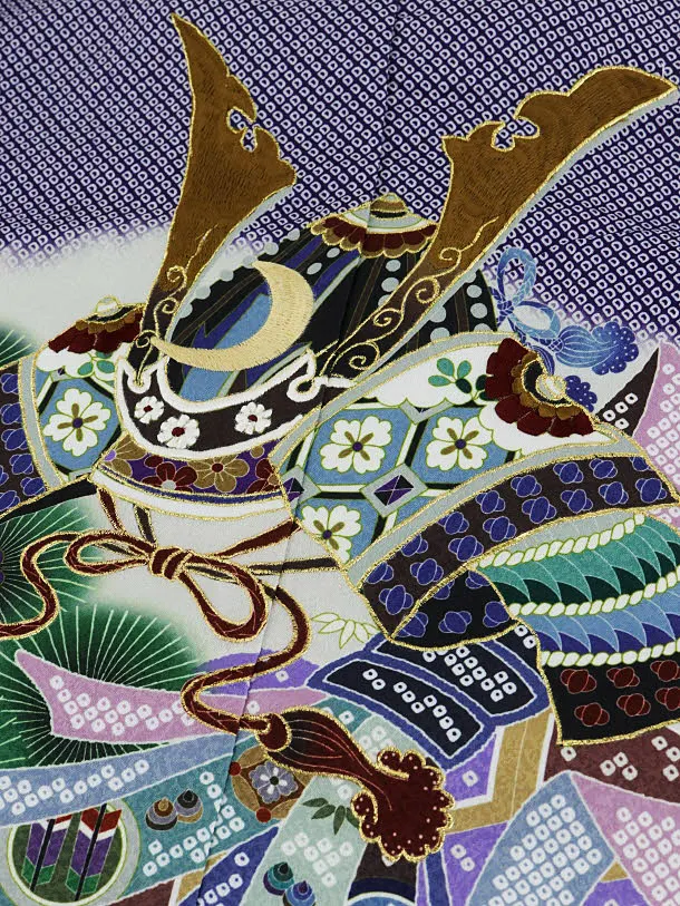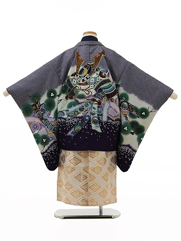 かんたん七五三レンタル(5歳男袴)X079パープル疋田柄兜×アイボリー菱袴