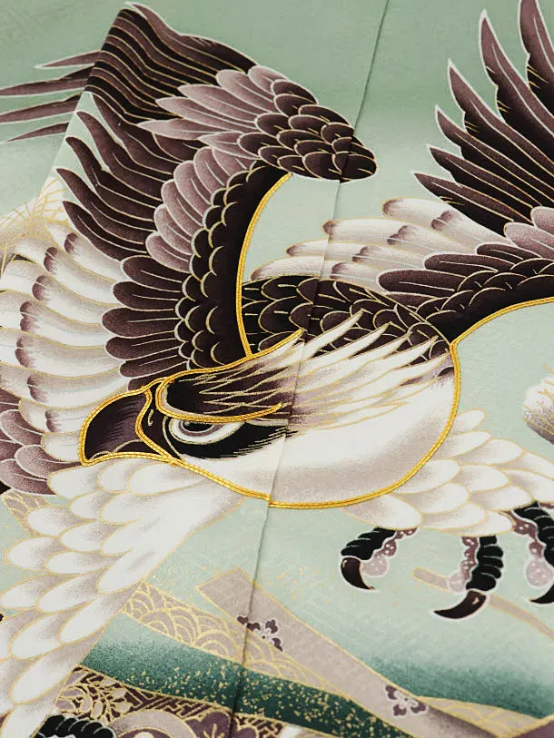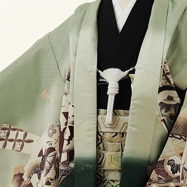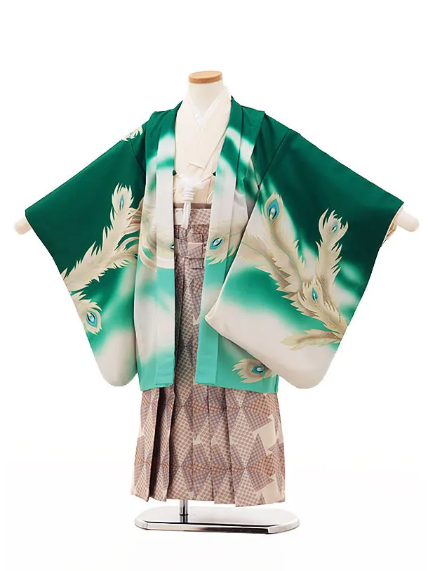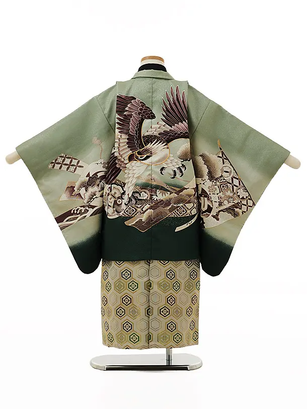 かんたん七五三レンタル(5歳男袴)X080グリーンぼかし几帳鷹×グレージュ亀甲袴