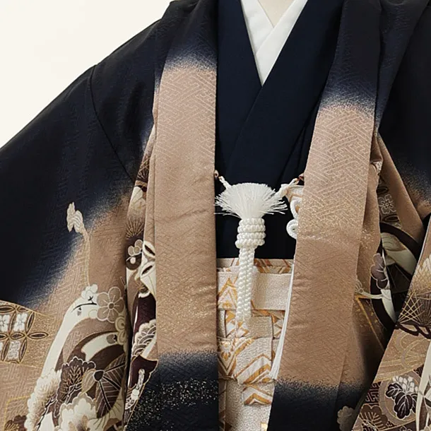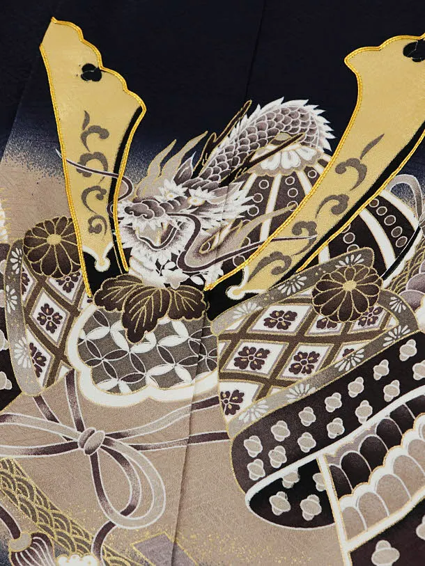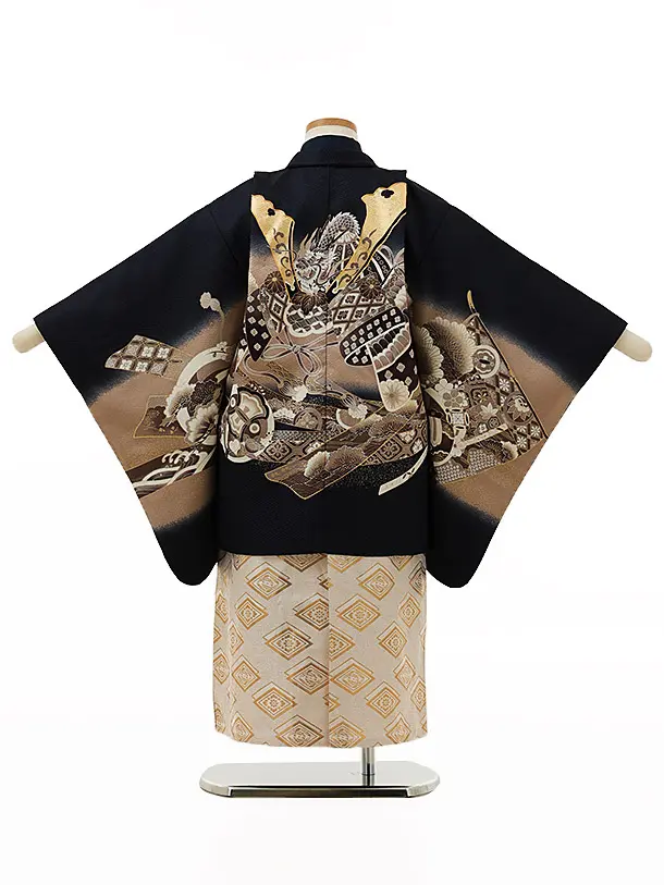 かんたん七五三レンタル(5歳男袴)X083紺ベージュ几帳兜×アイボリー菱袴