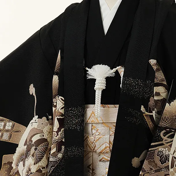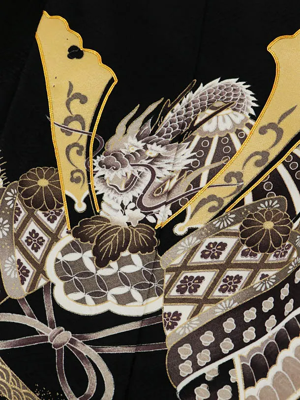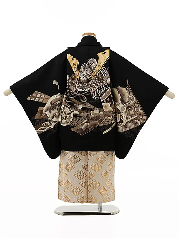 かんたん七五三レンタル(5歳男袴)X084黒地几帳兜×アイボリー菱袴