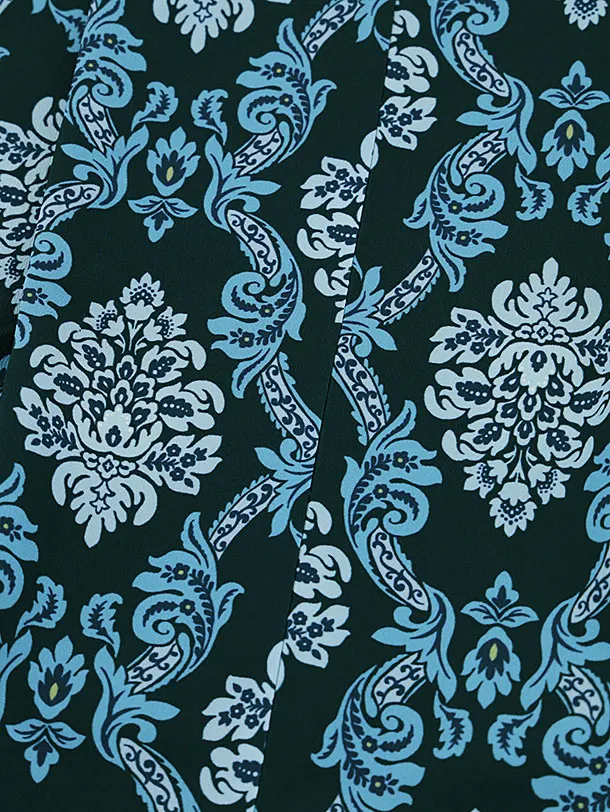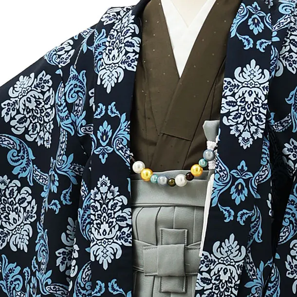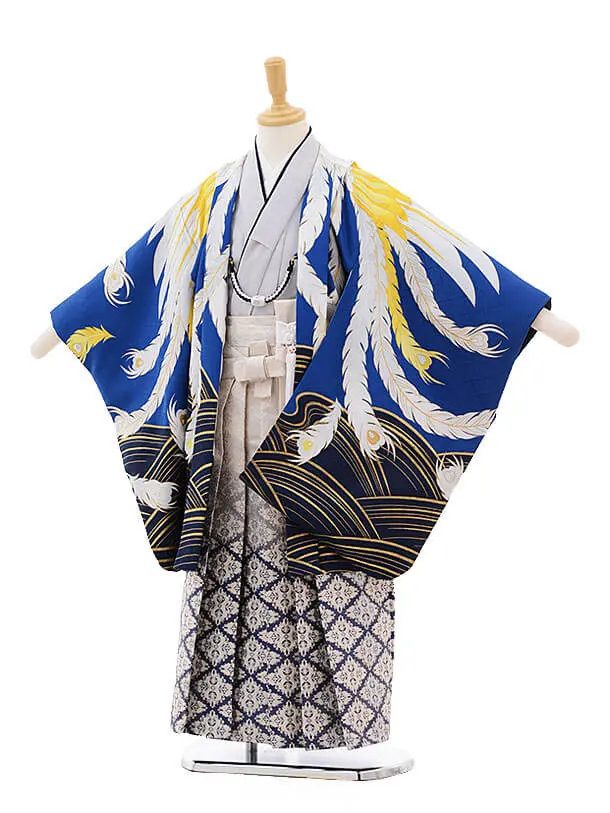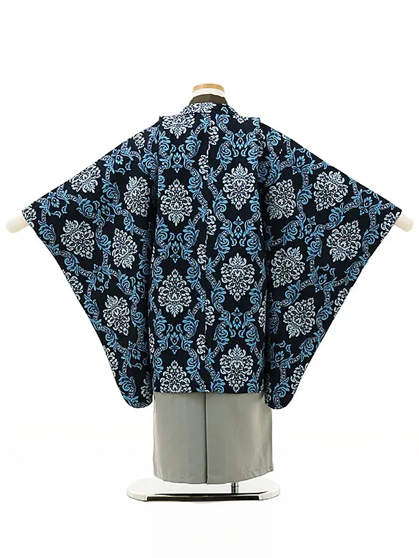 かんたん七五三レンタル(5歳男袴)X119紺ブルーダマスク柄xグレー袴