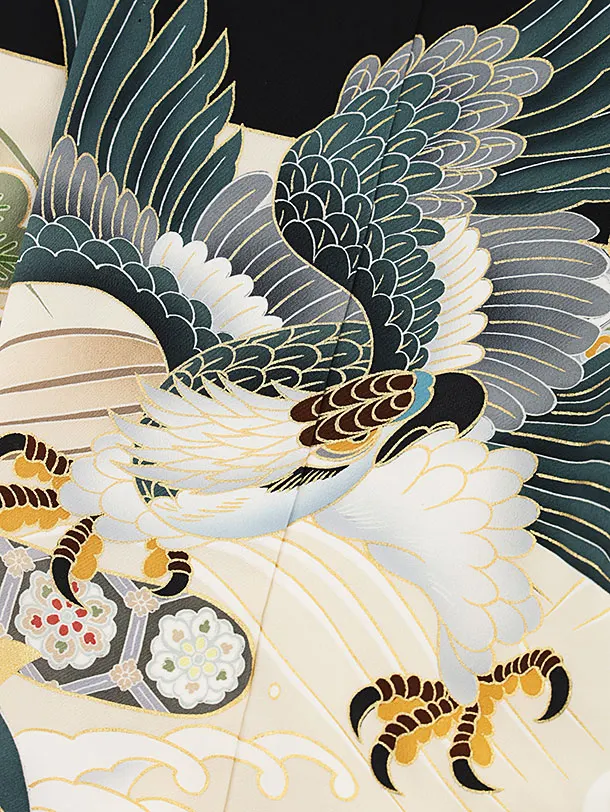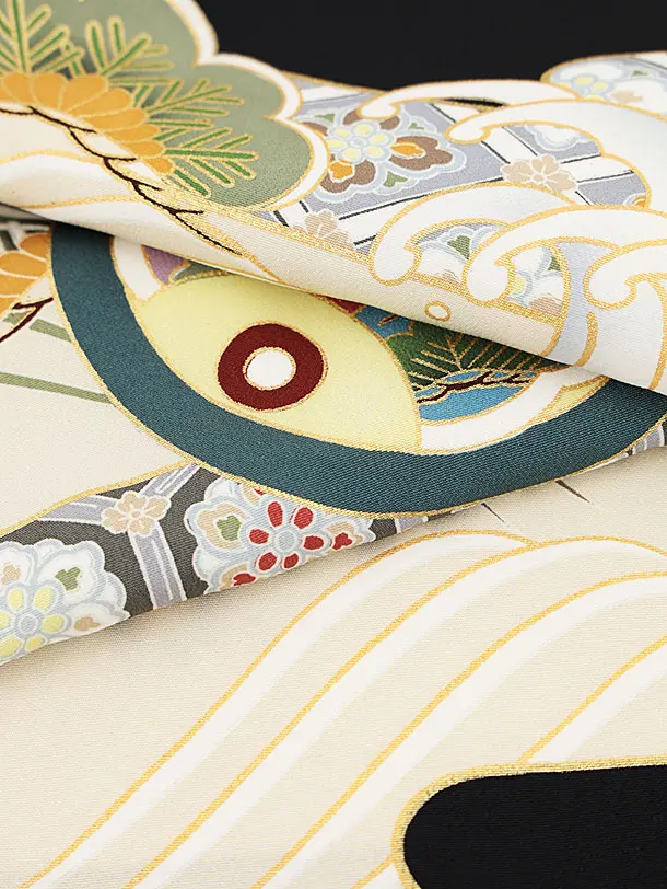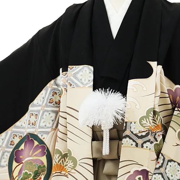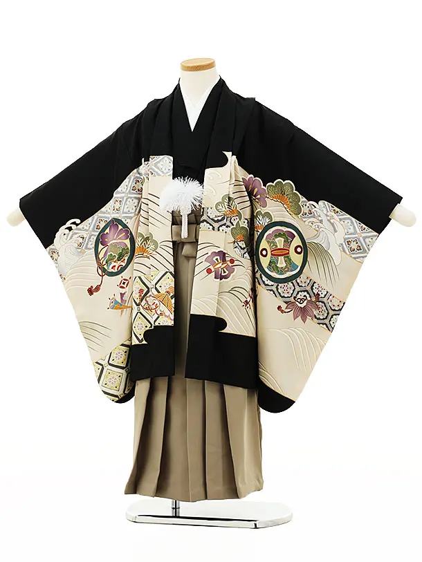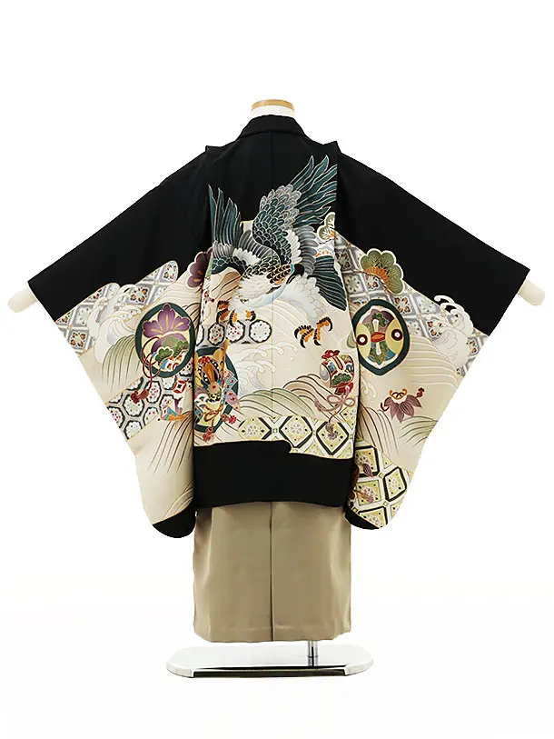 七五三レンタル(5歳男袴)X133【正絹】黒地波に丸紋鷹xベージュ袴