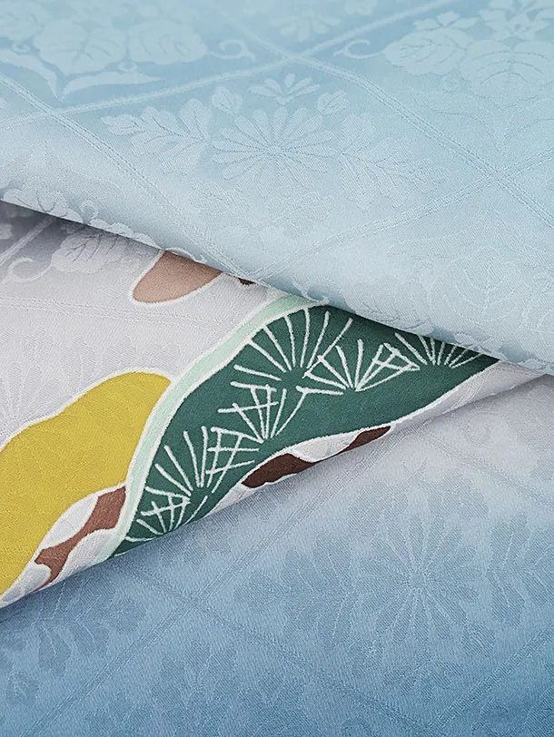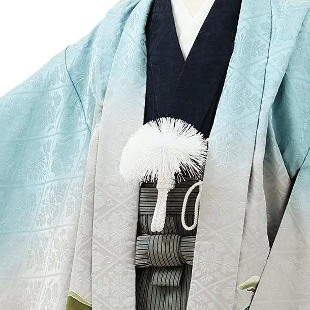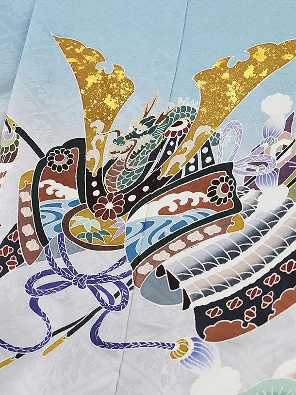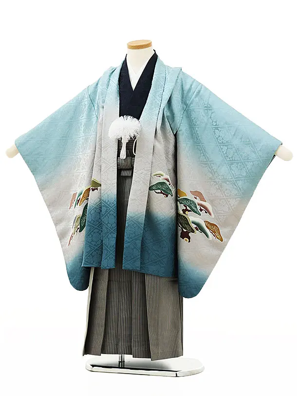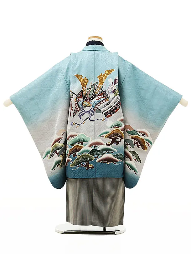 七五三レンタル(5歳男袴)X141【高級正絹】水色松に兜x黒グレー縞袴