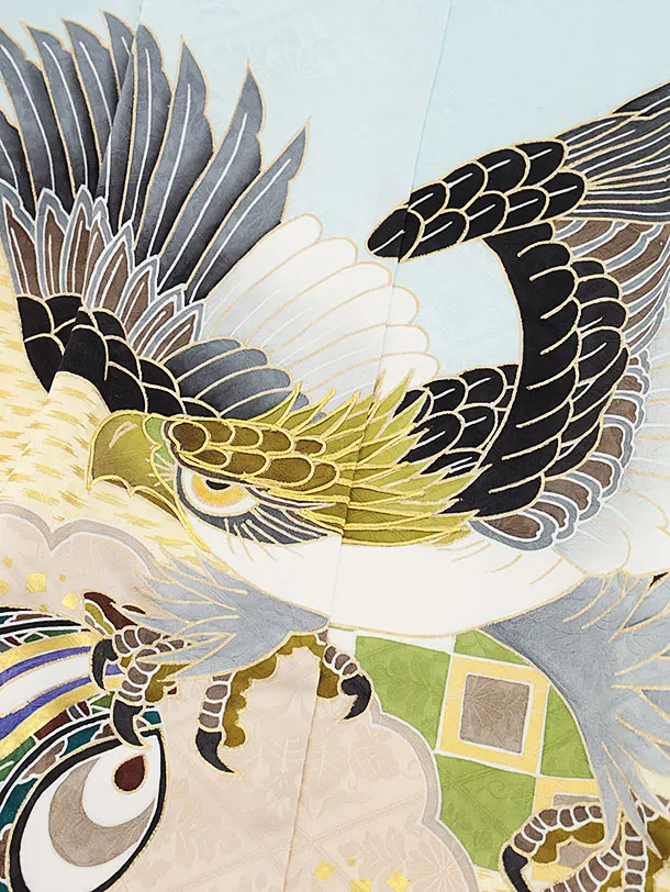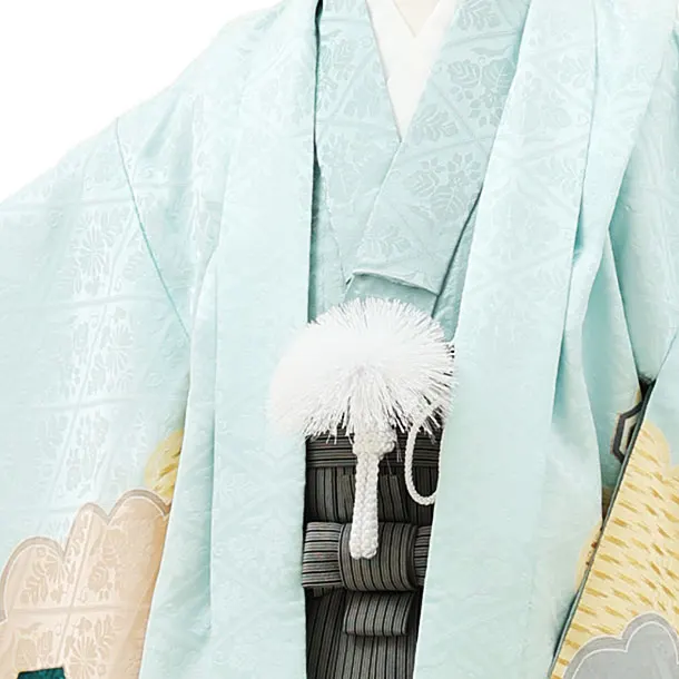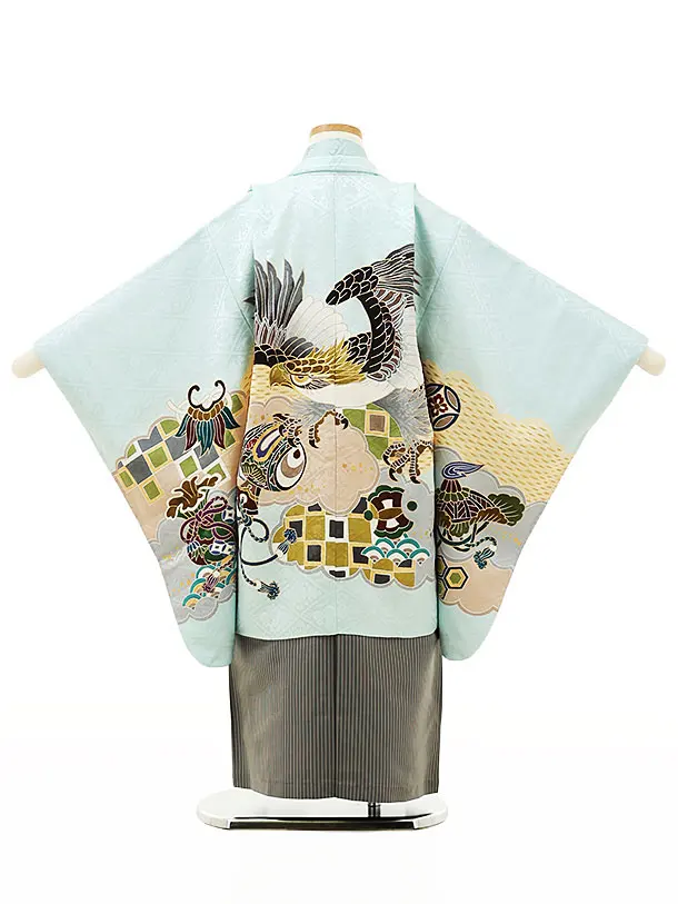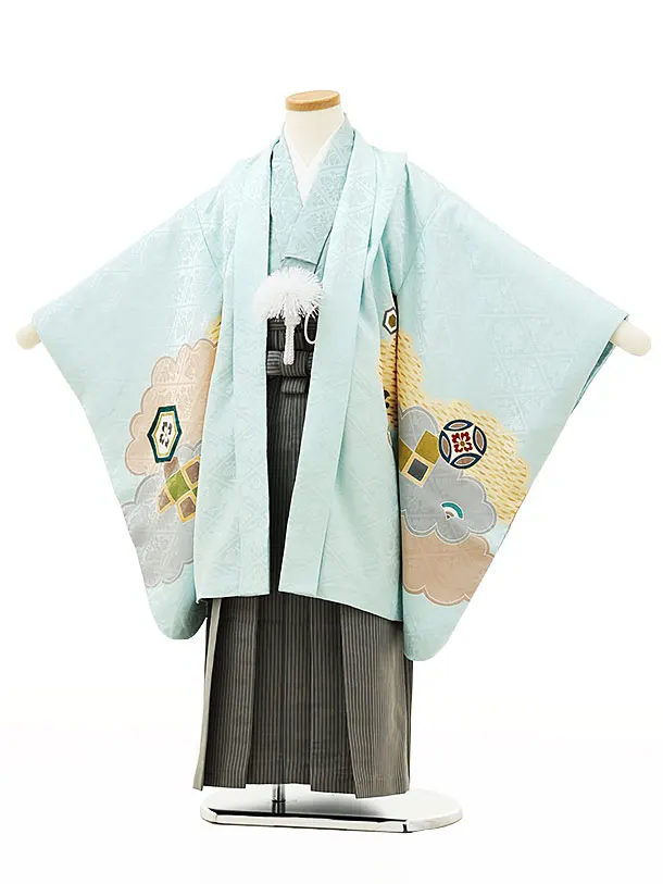 七五三レンタル(5歳男袴)X144【高級正絹】水色雲取り小槌鷹x黒グレー縞袴