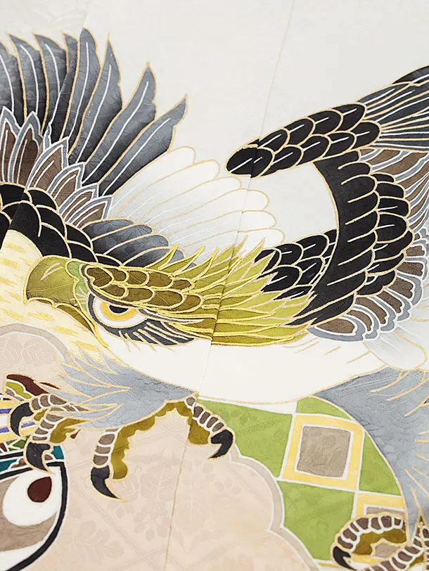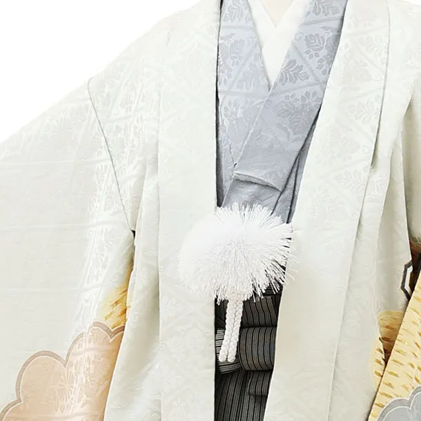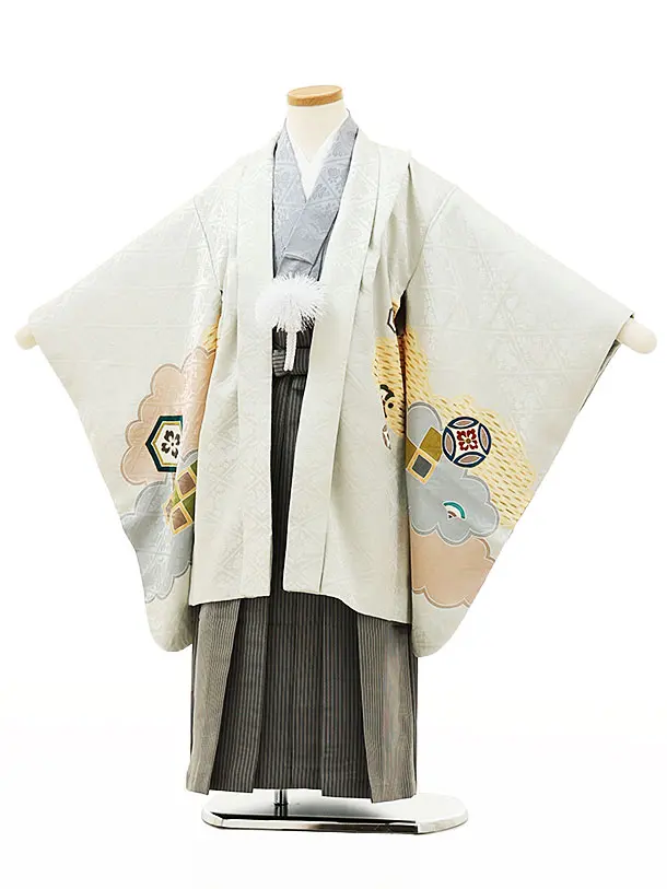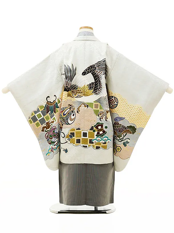 七五三(5歳男袴)X145【高級正絹】淡グレー雲取り小槌鷹x黒グレー縞袴