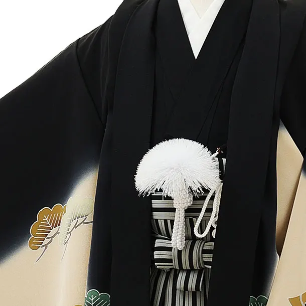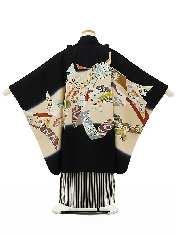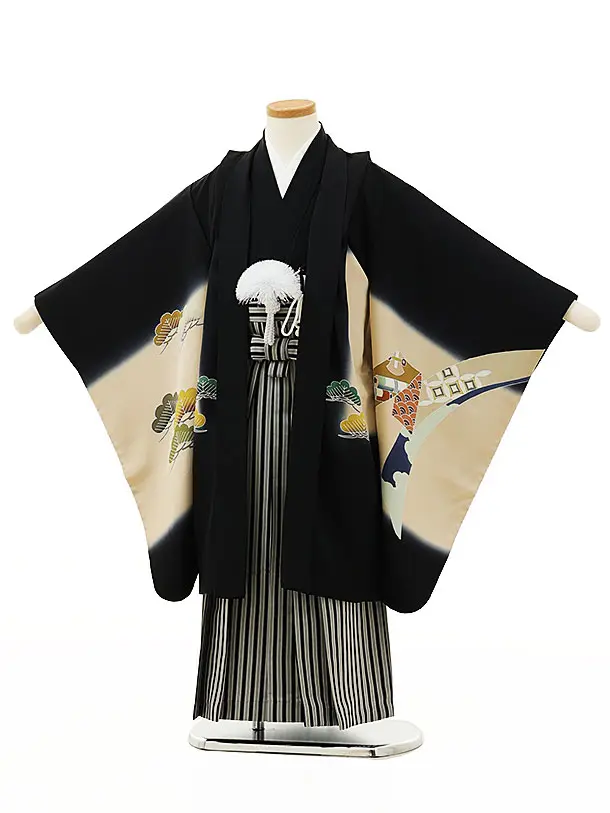 七五三レンタル(5歳男袴)X169【高級正絹】黒地松に束ねのしx黒縞袴