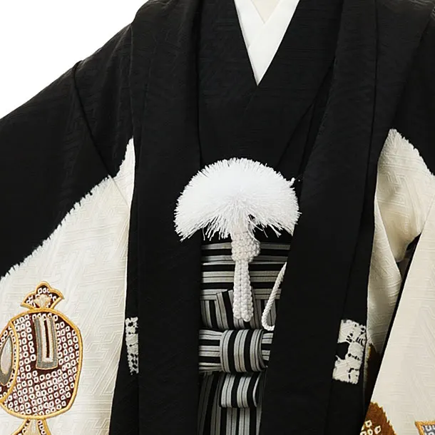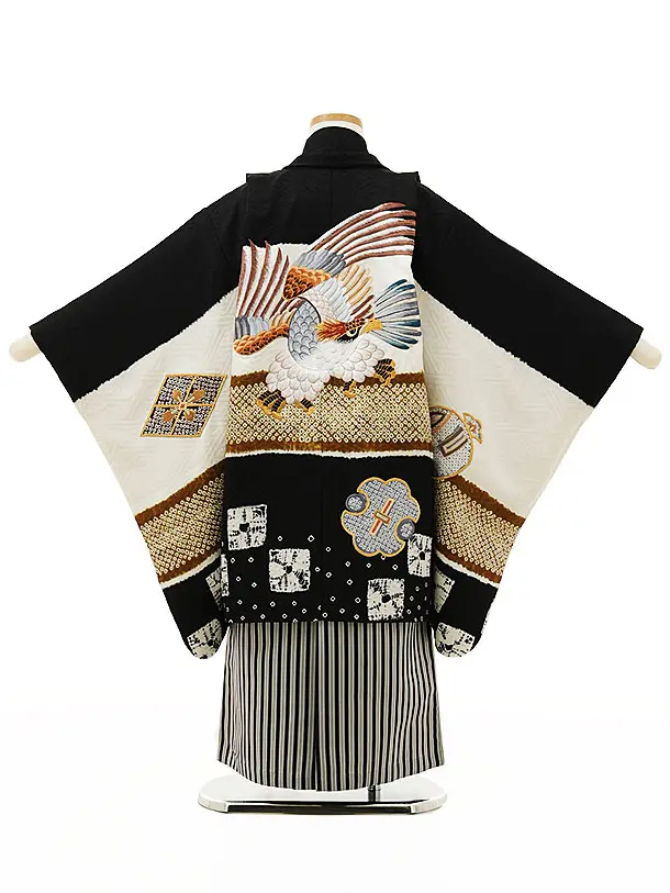 七五三レンタル(5歳男袴)X177【高級正絹】黒地小槌菱刺繍兜x黒縞袴