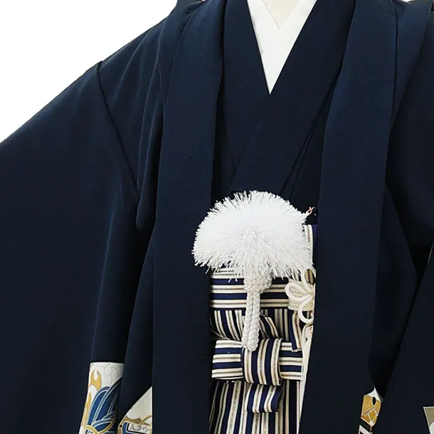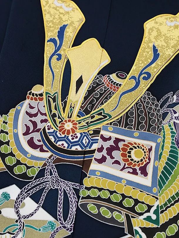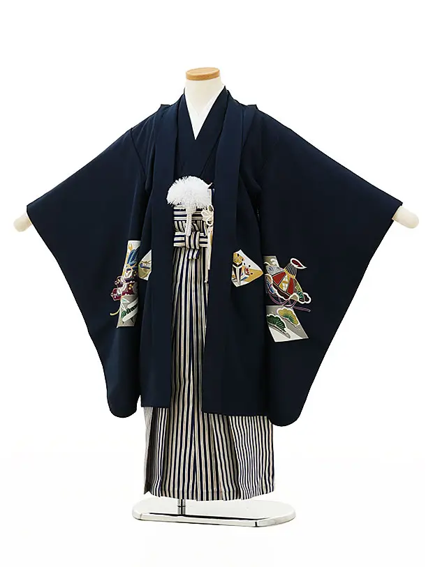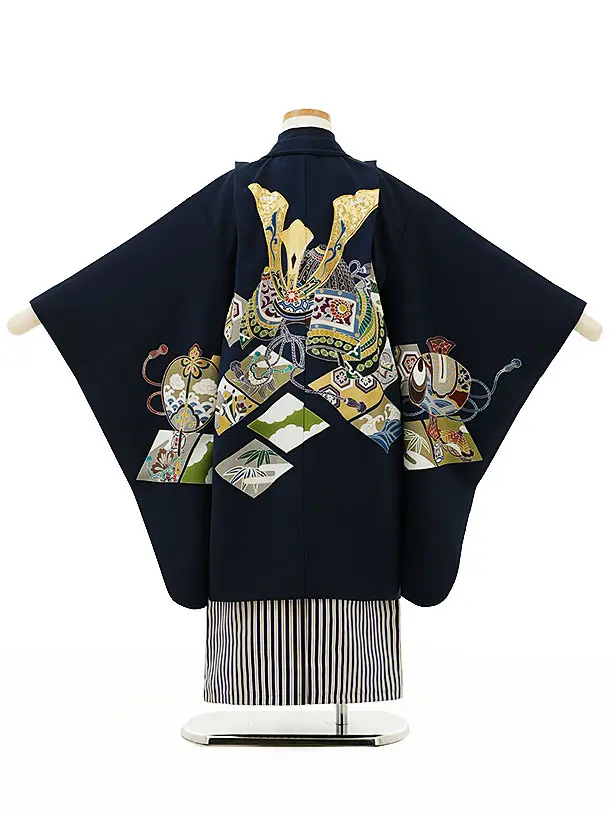 七五三レンタル(5歳男袴)X182【高級正絹】紺地吉祥文様兜x紺縞袴