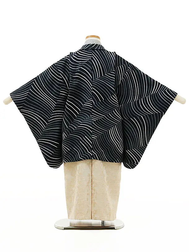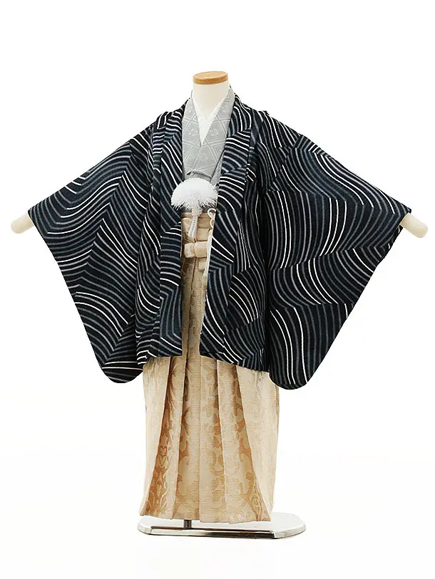 七五三(5歳男袴)X203【正絹】ネイビー変わりストライプxライトベージュ袴