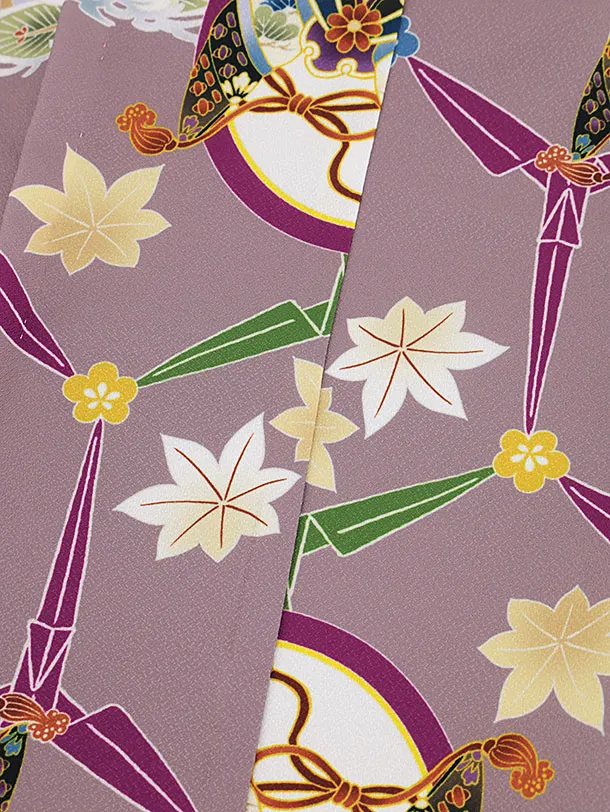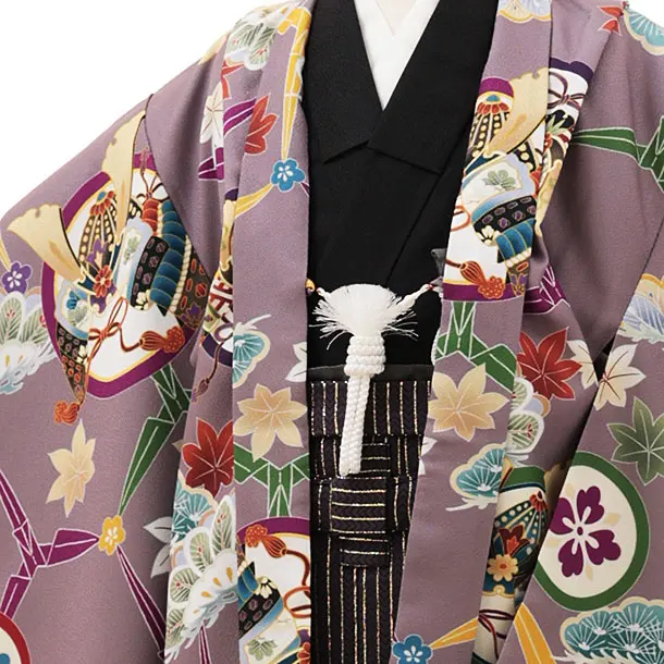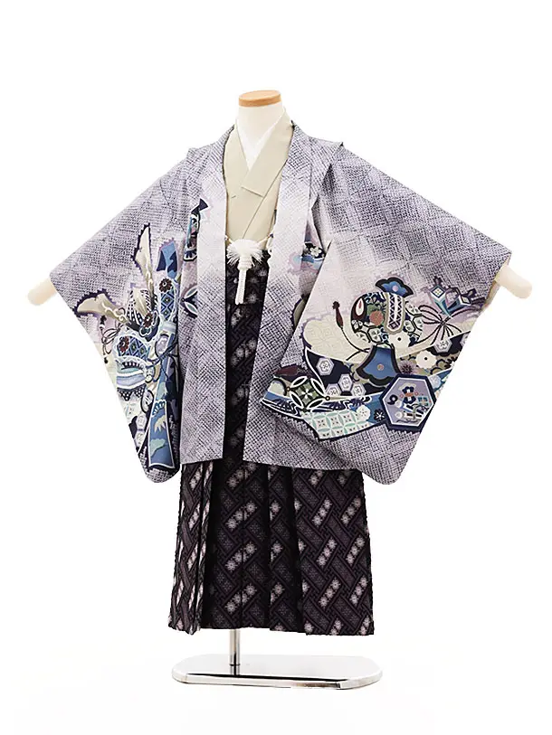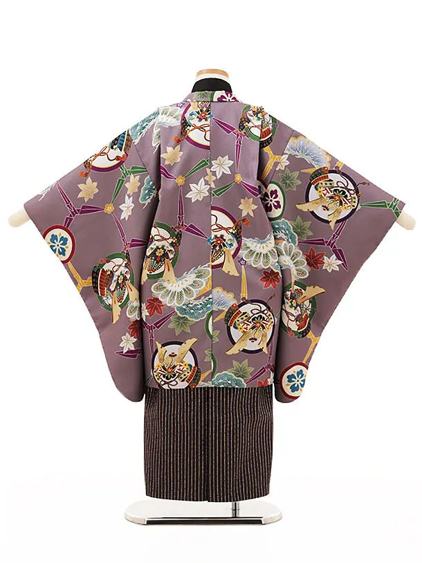 かんたん七五三(5歳男袴)X244パープルグレー丸紋兜xブラウンストライプ