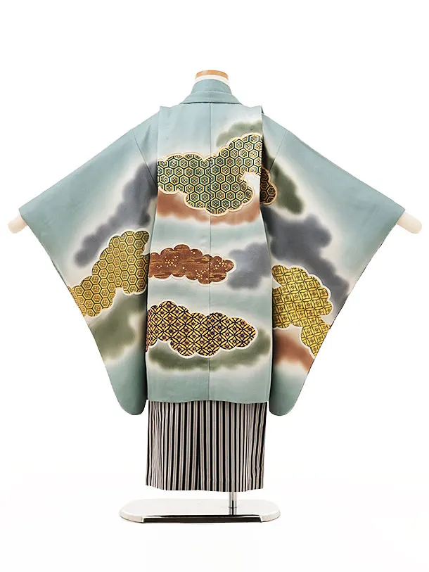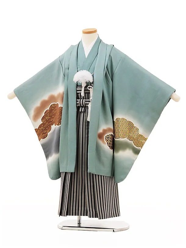 七五三(5歳男袴)X271【高級正絹】ペールグリーン雲取りx黒縞