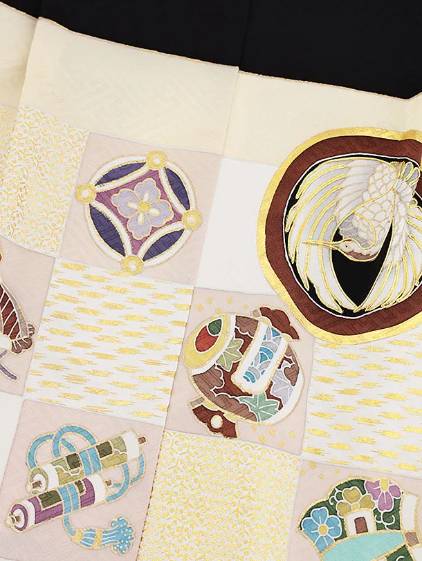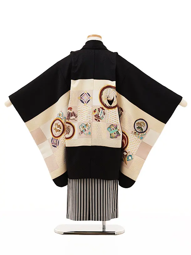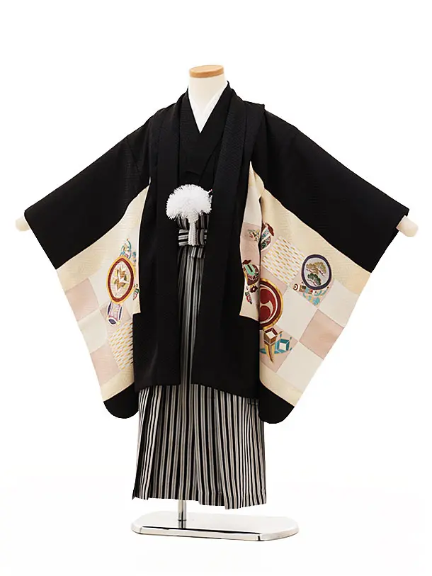七五三(5歳男袴)X273【高級正絹】黒地市松に宝尽しx黒縞