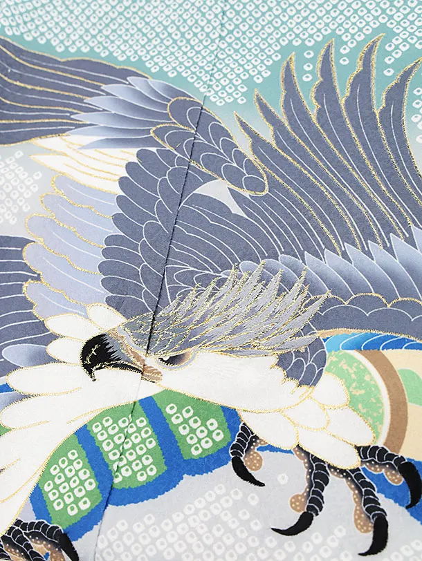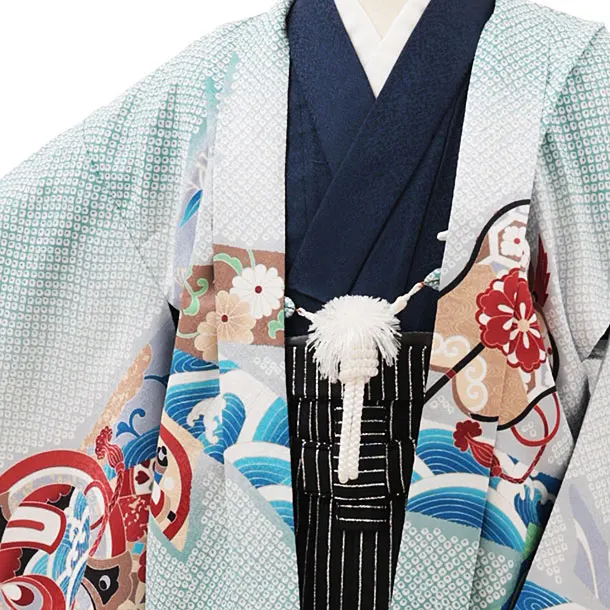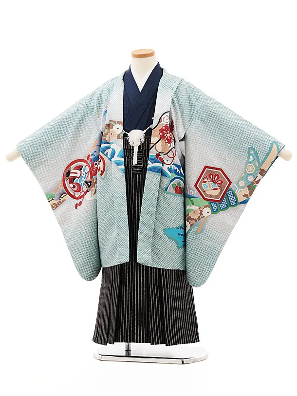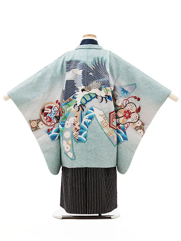 かんたん七五三(5歳男袴)X326 グリーン疋田柄熨斗に鷹×黒シルバーストライプ