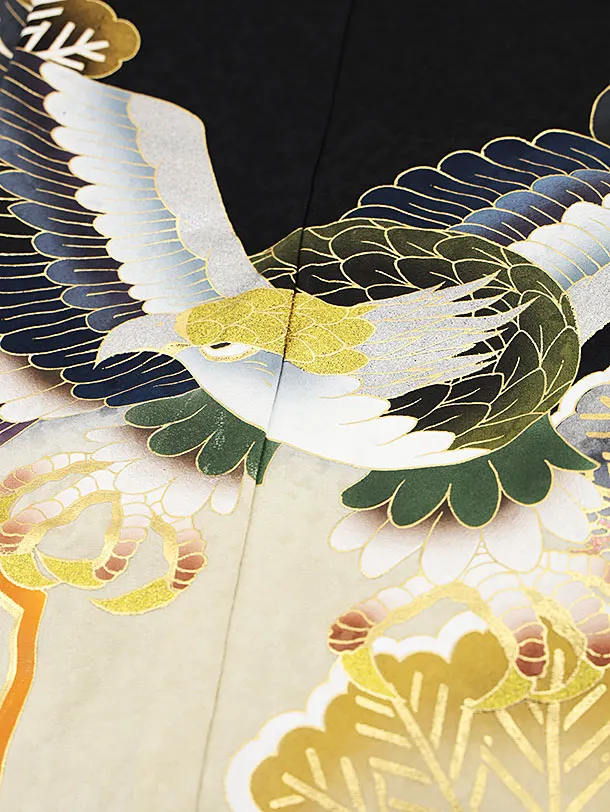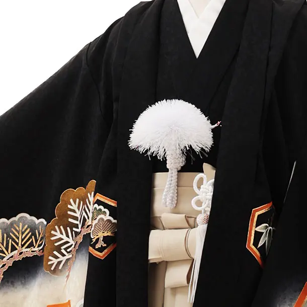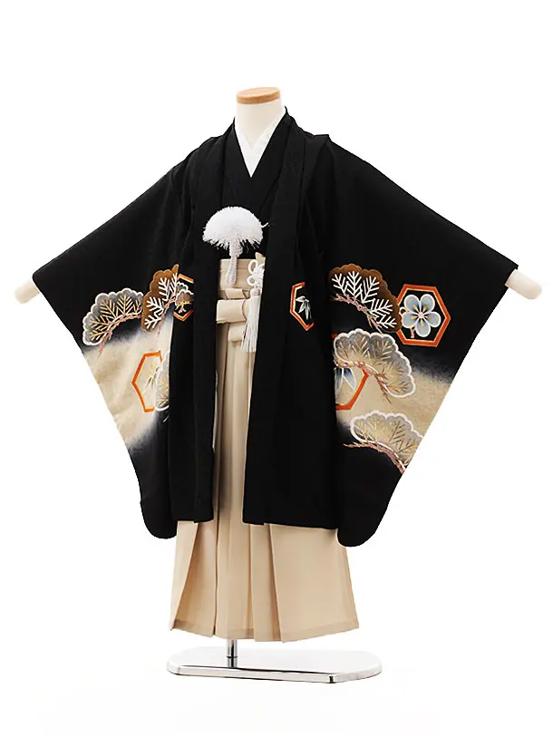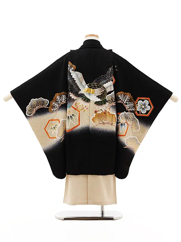 七五三(5歳男袴)X336【正絹】黒地亀甲紋に鷹×ベージュ