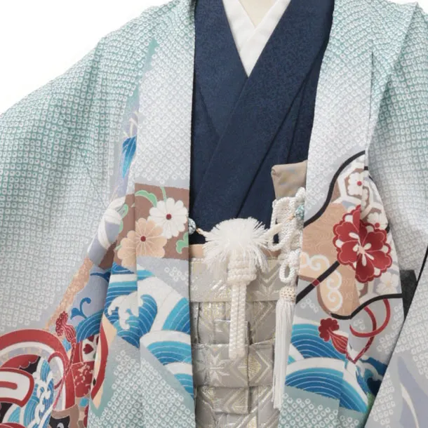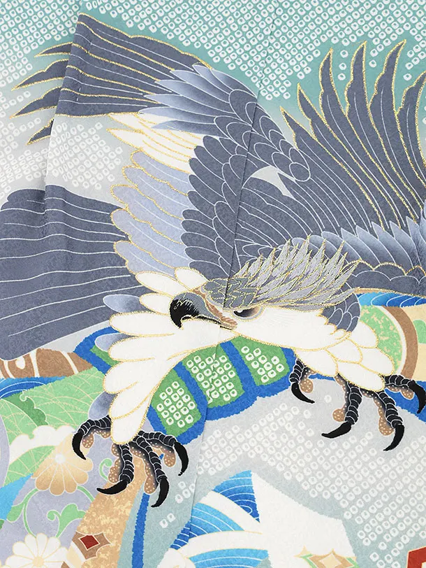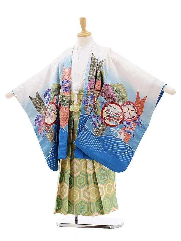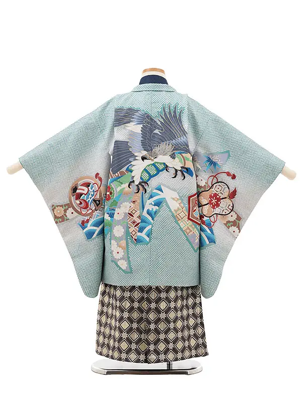 かんたん七五三(5歳男袴)X385 グリーン疋田柄束ね熨斗鷹×グレーぼかし