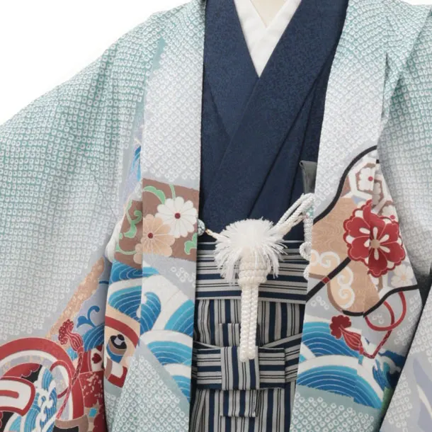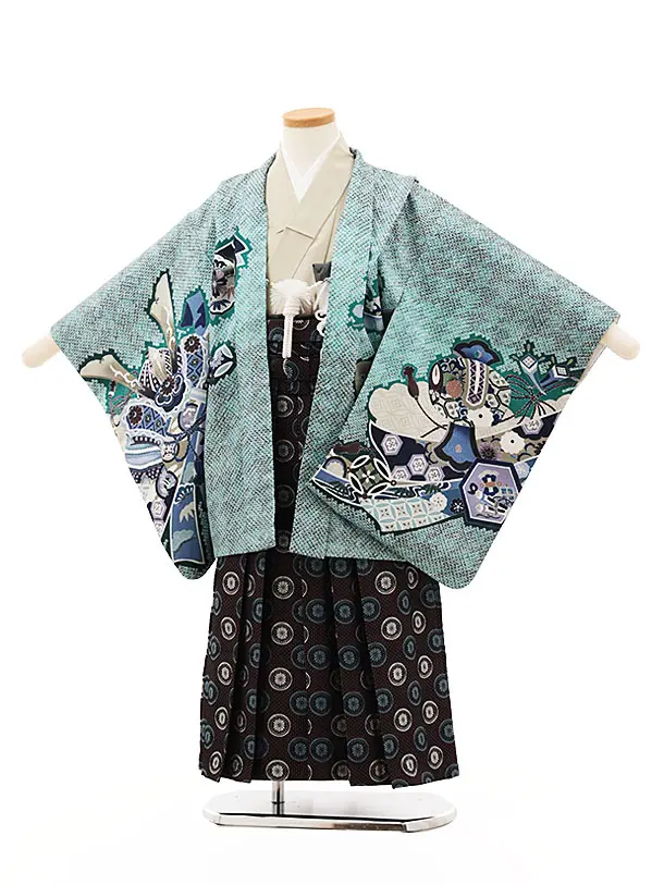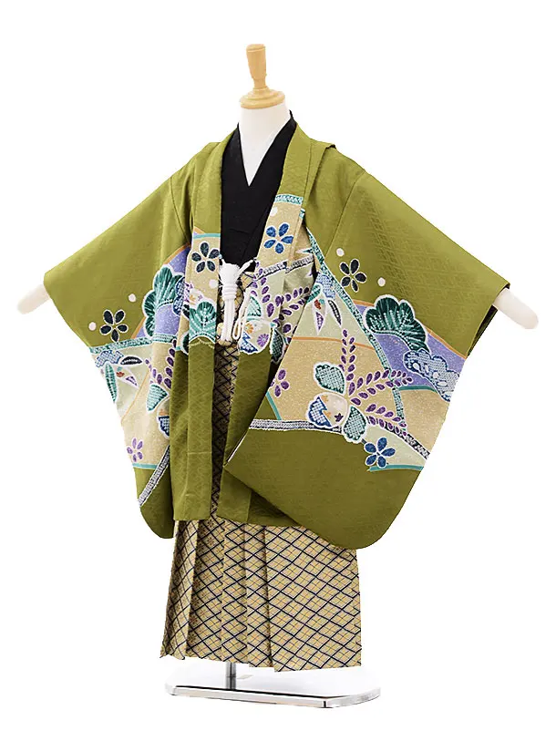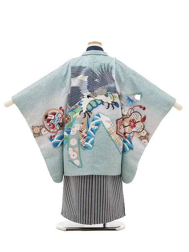 かんたん七五三(5歳男袴)X386 グリーン疋田柄束ね熨斗鷹×紺縞