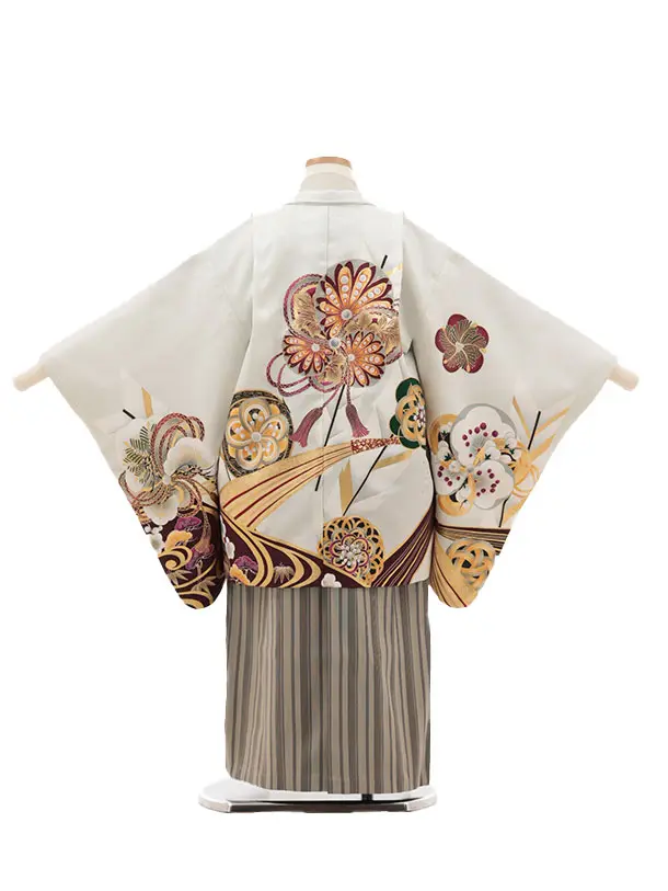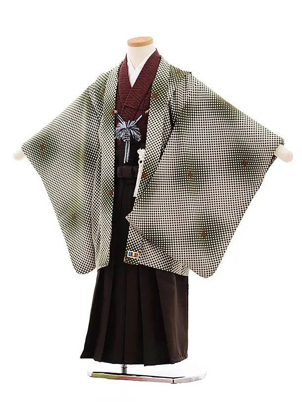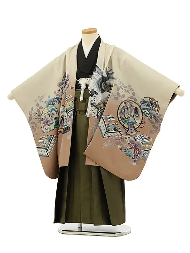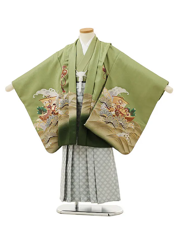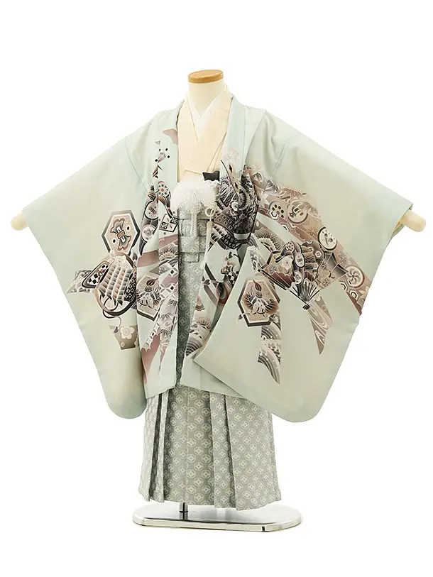 かんたん七五三(5歳男袴)X413 淡グリーン波に吉祥文様×ベージュストライプ