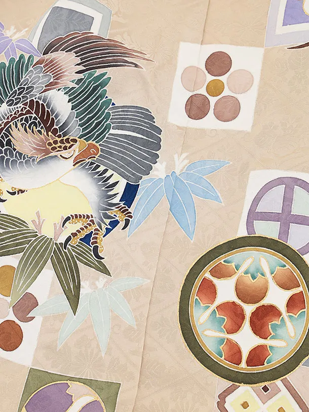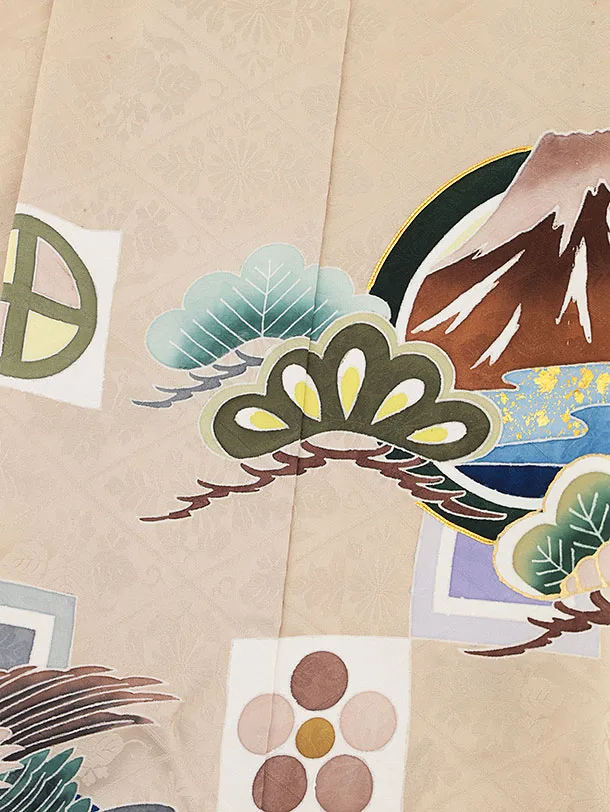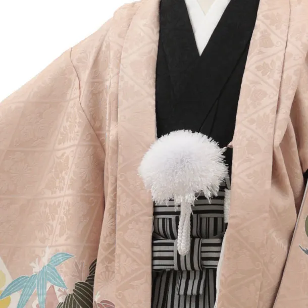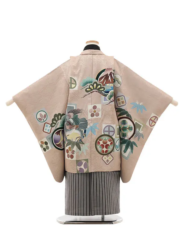 七五三(5歳男袴)X437【高級正絹】ベージュ地吉祥文様×黒縞