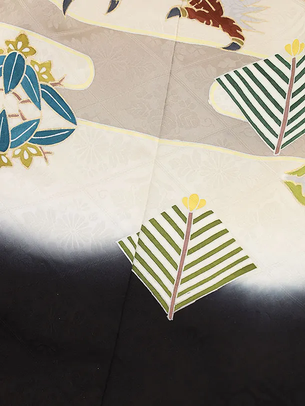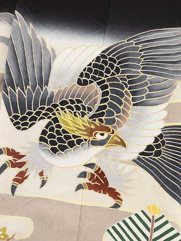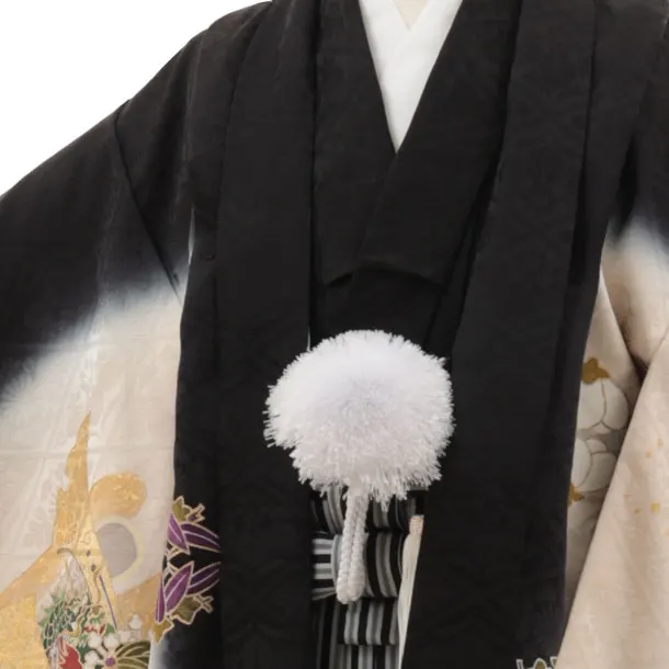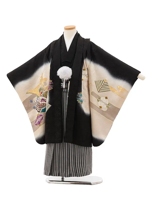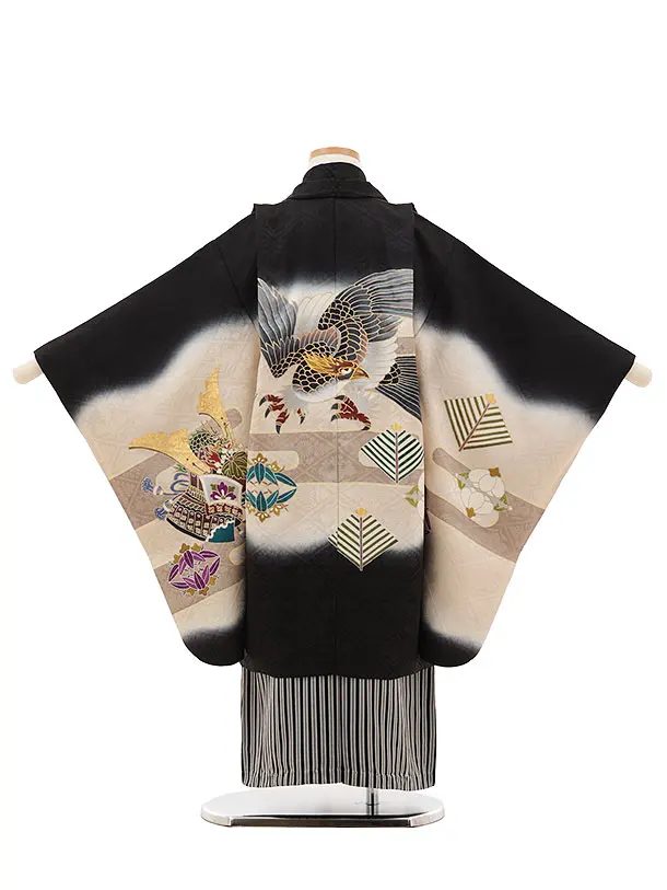 七五三(5歳男袴)X448【高級正絹】黒地松葉鷹兜×黒縞