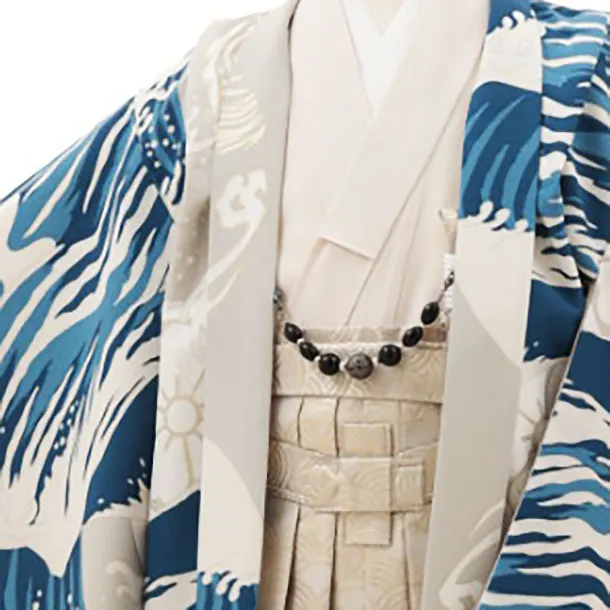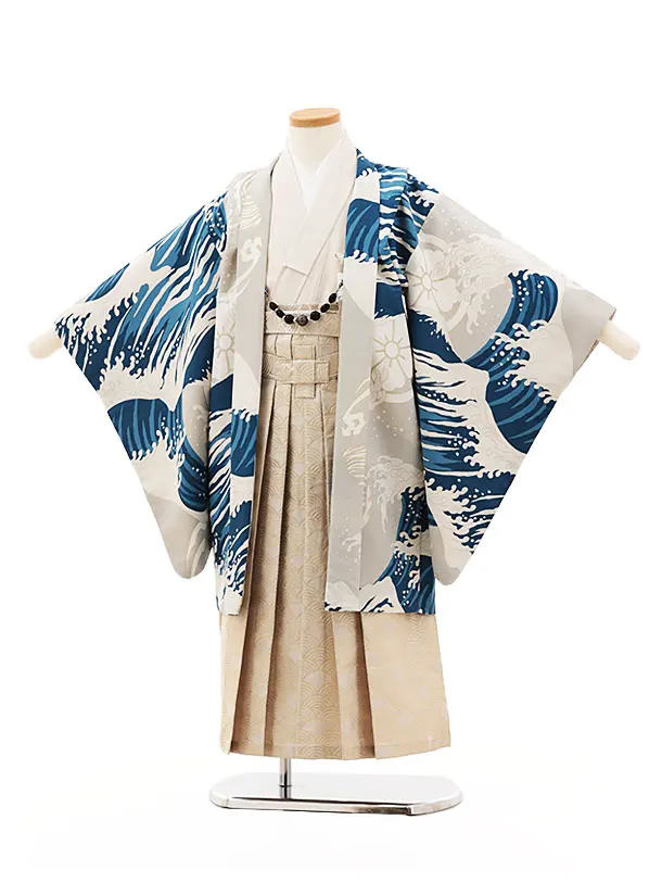 かんたん七五三(5歳男袴)X461 ぷちぷり グレーブルー 波と龍×ベージュ金