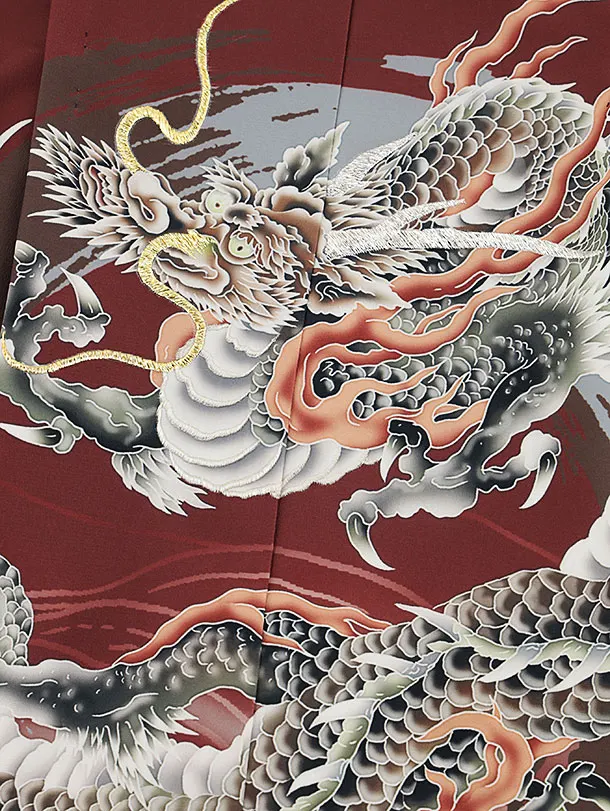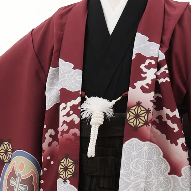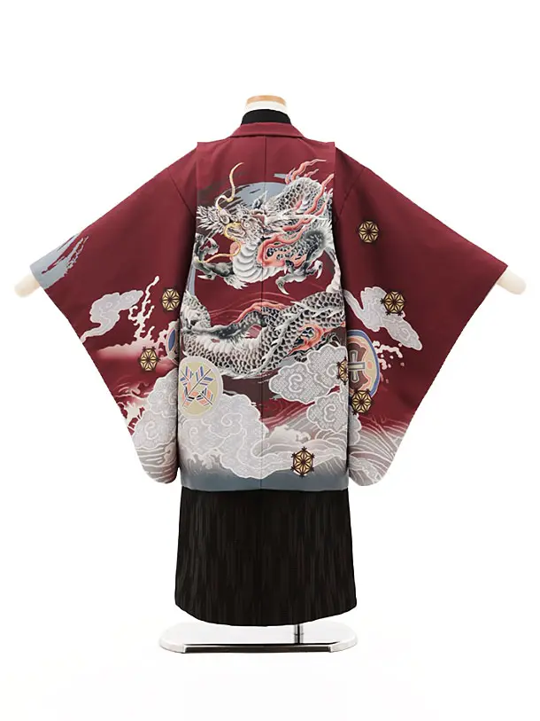 かんたん七五三(5歳男袴)X468 エンジ色 雲に龍×茶緑矢柄
