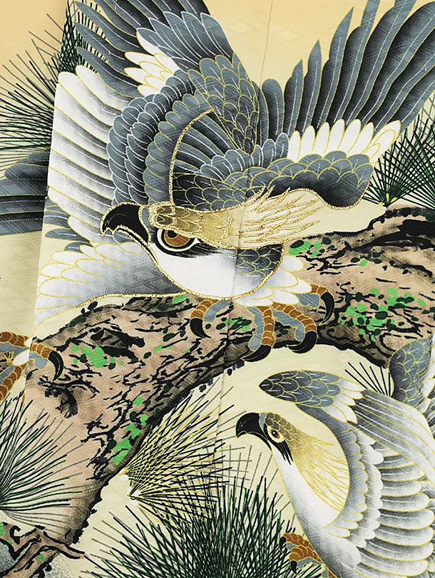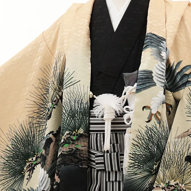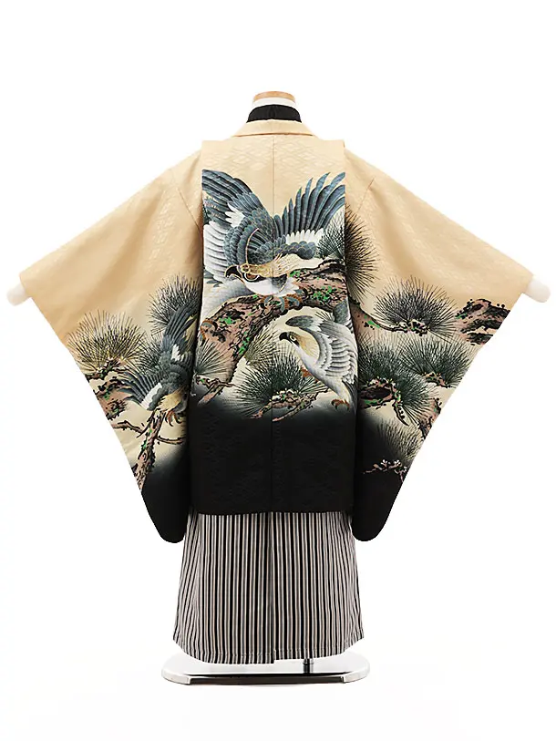 かんたん七五三(5歳男袴)X472 薄からし色 松に鷹×黒縞