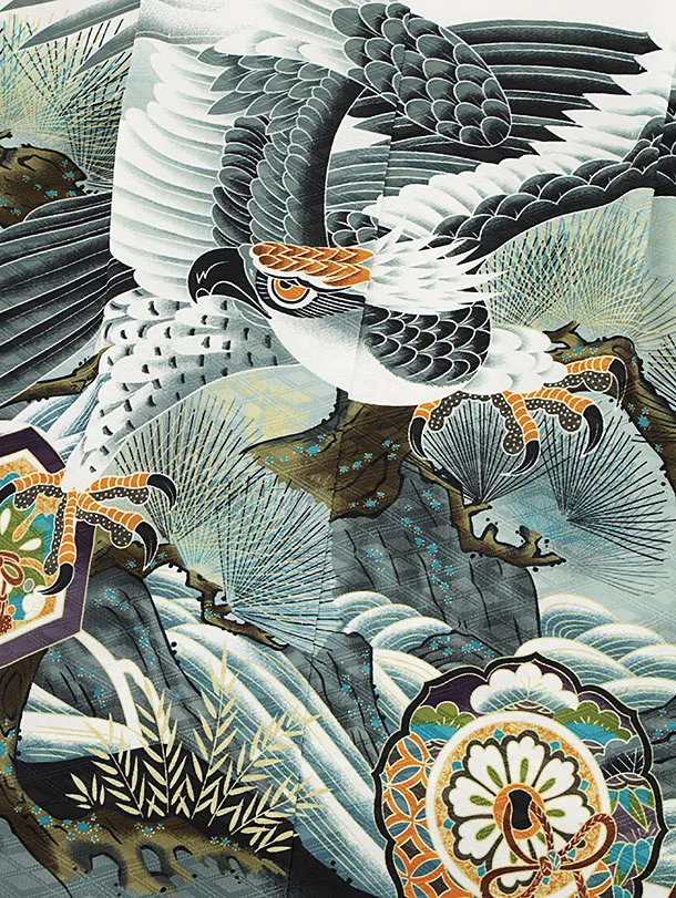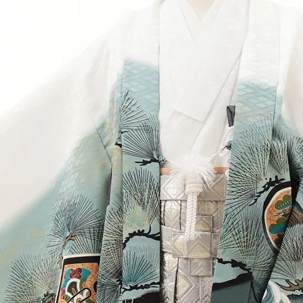 かんたん七五三(5歳男袴)X474 白地 松波に鷹×グレーぼかし