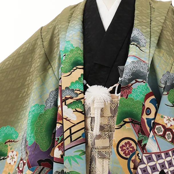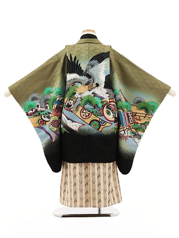 かんたん七五三(5歳男袴)X477 抹茶色 熨斗松に鷹×ベージュストライプ