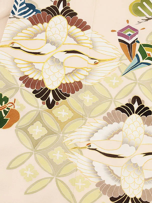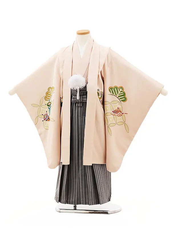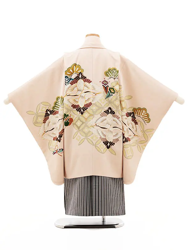 七五三(5歳男袴)X494【高級正絹】ピンク地 対い鶴×黒縞