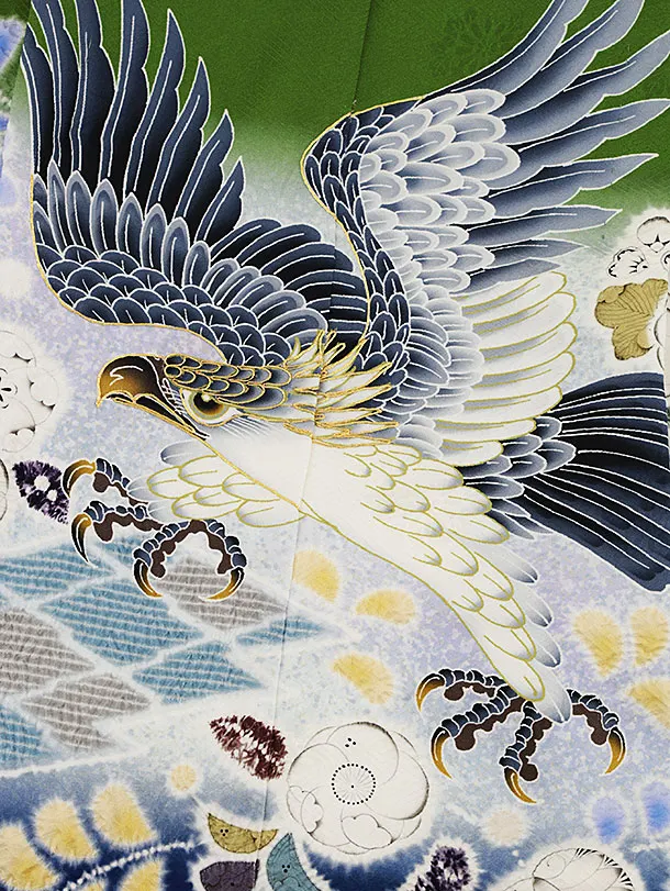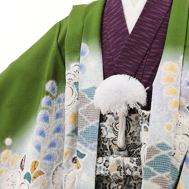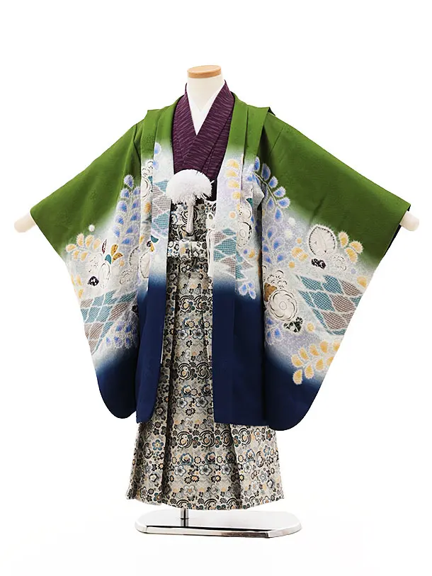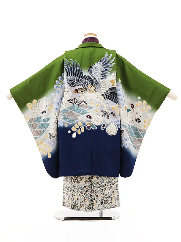 七五三(5歳男袴)X525【正絹】緑 裾紺辻が花鷹×ベージュ梅