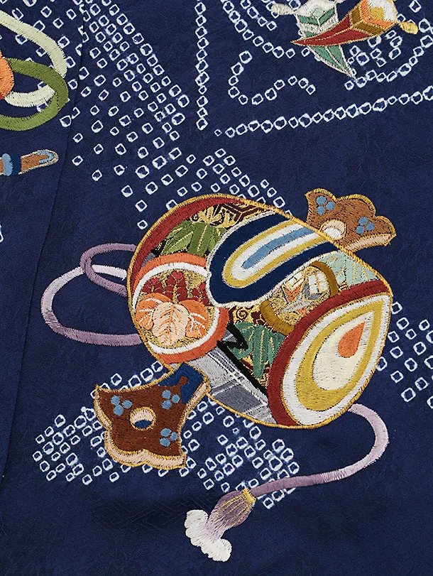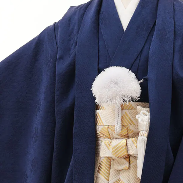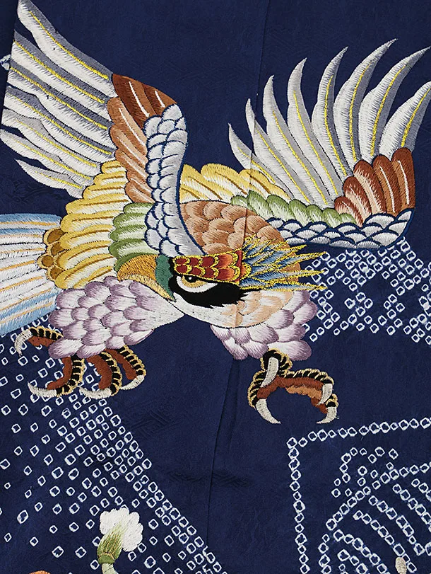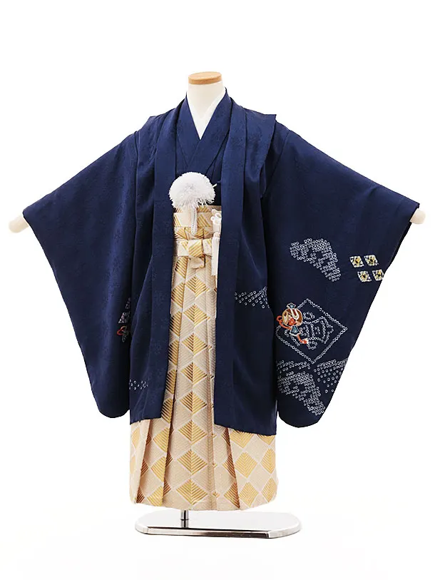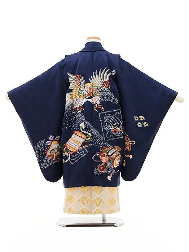 七五三(5歳男袴)X556【正絹】紺地刺繍鷹×白ゴールド菱