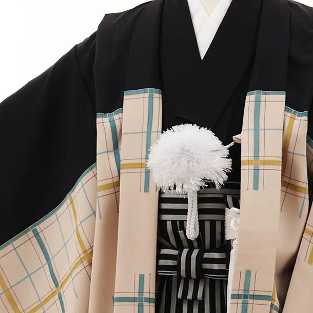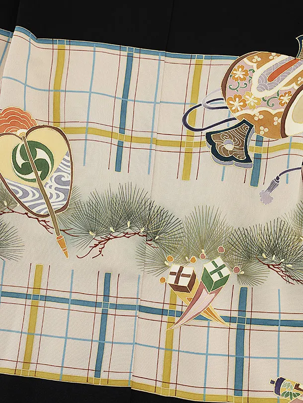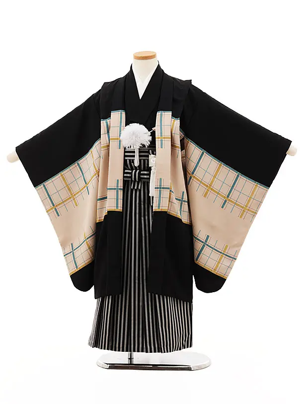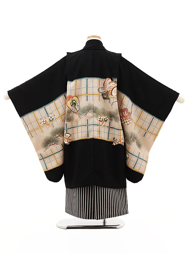 七五三(5歳男袴)X559【高級正絹】黒地格子に吉祥文様×黒縞