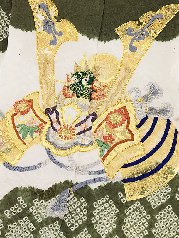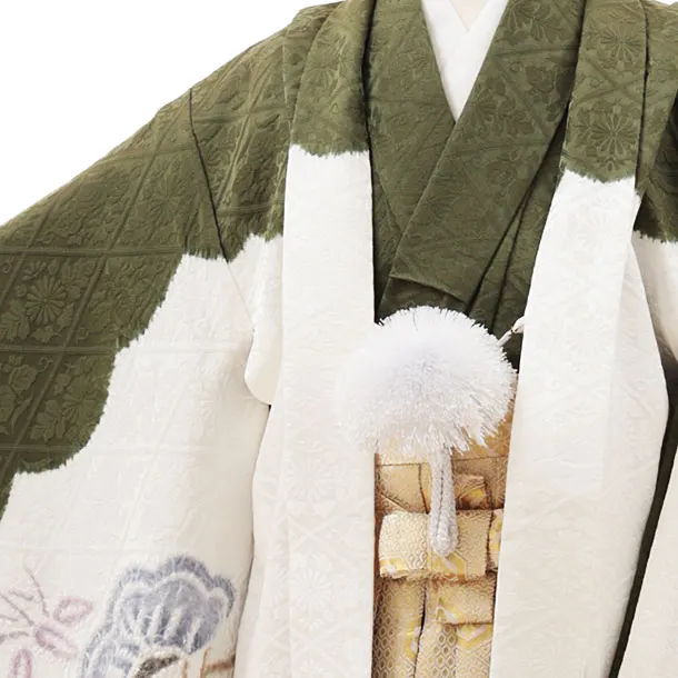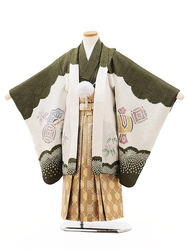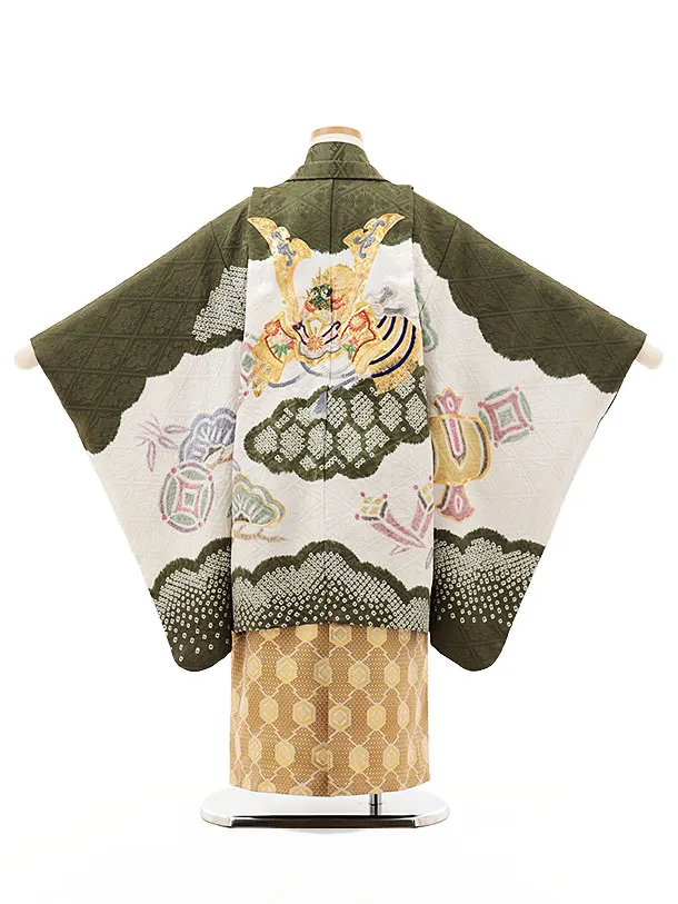 七五三(5歳男袴)X577【高級正絹】松葉色 刺繍兜×キャメルぼかし