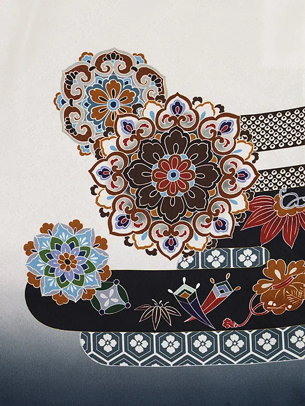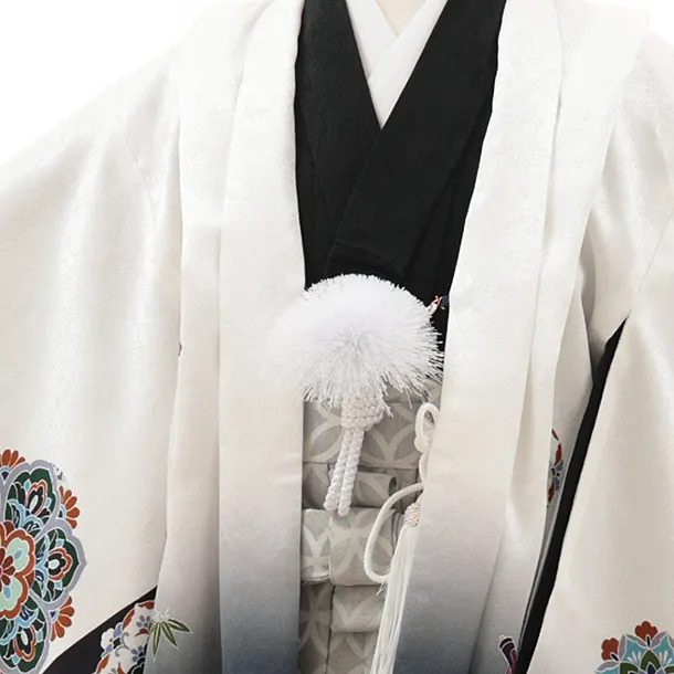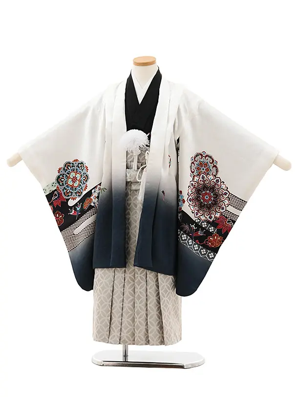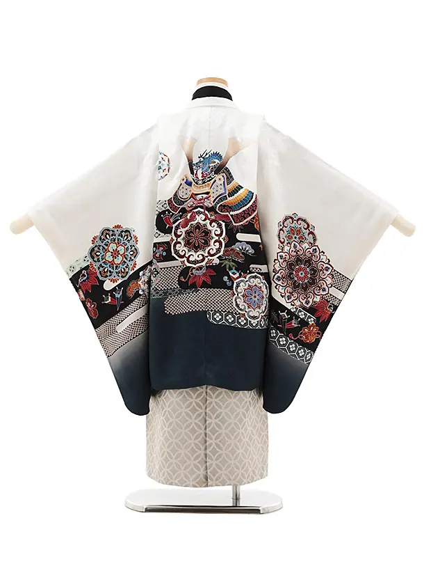 七五三(5歳男袴)X592【正絹】白地裾グレー 唐花に兜×シルバー