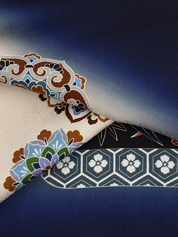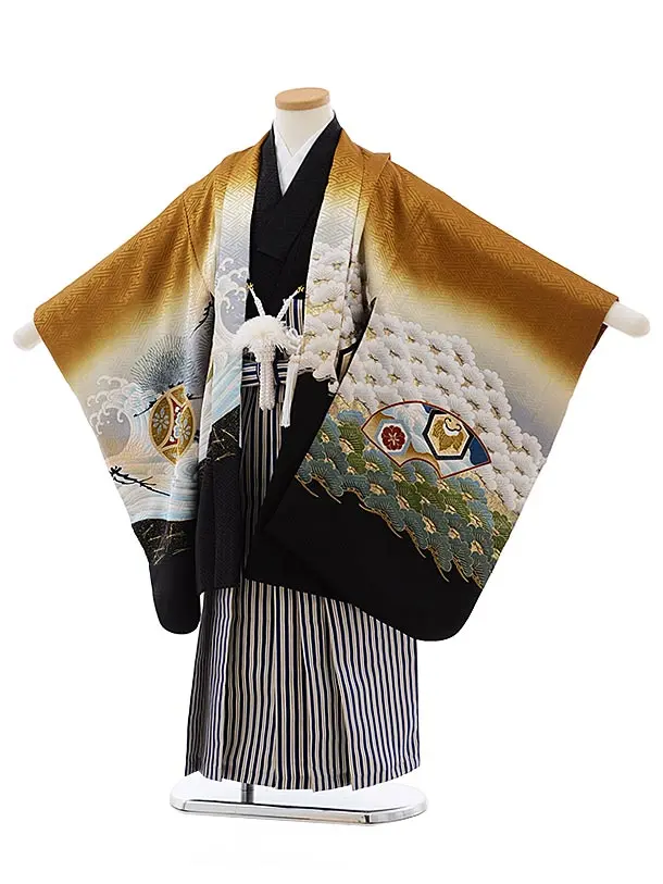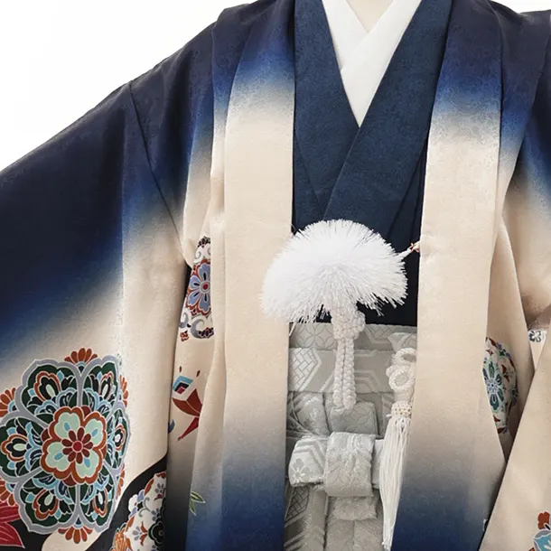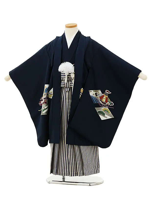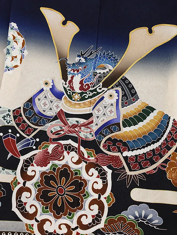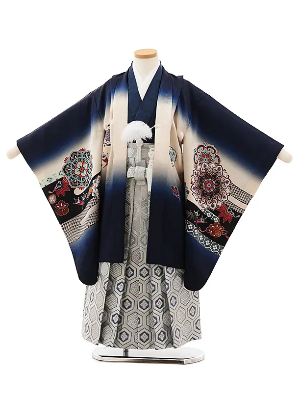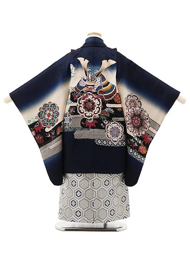 七五三(5歳男袴)X597【正絹】紺ぼかし 唐花に兜×シルバー