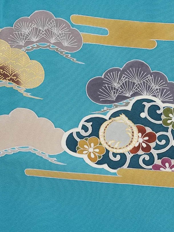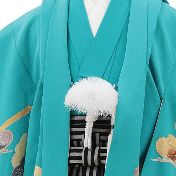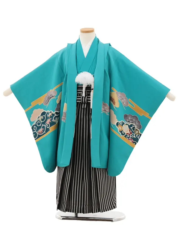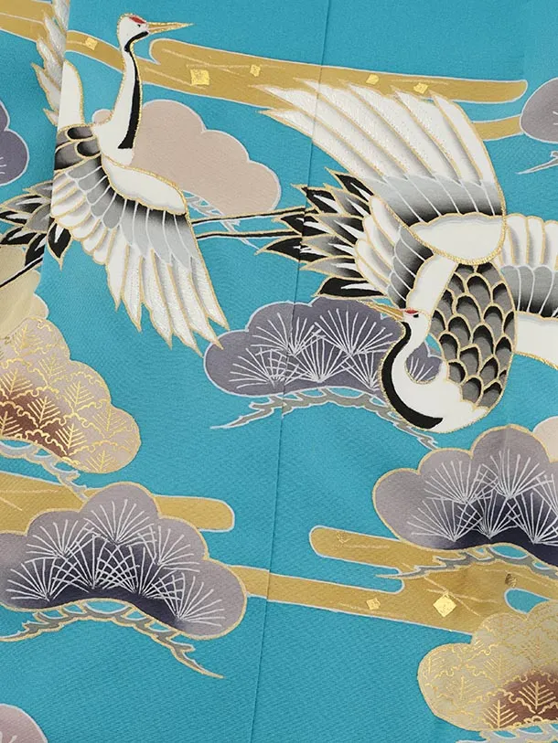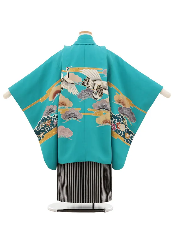 七五三(5歳男袴)X647【高級正絹】ブルー地 霞 松に二羽鶴×黒縞