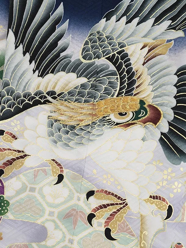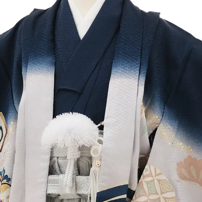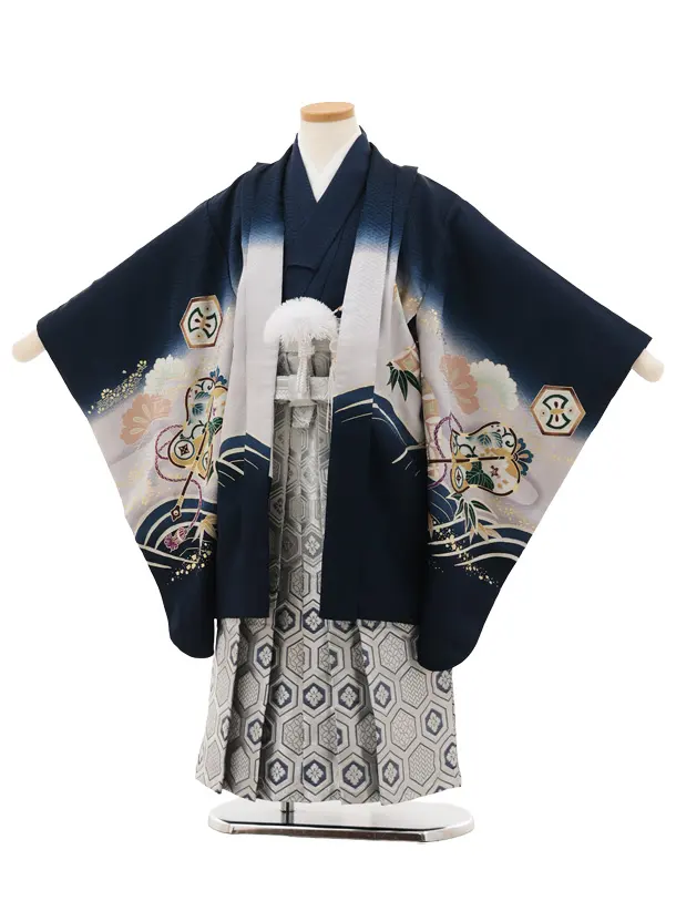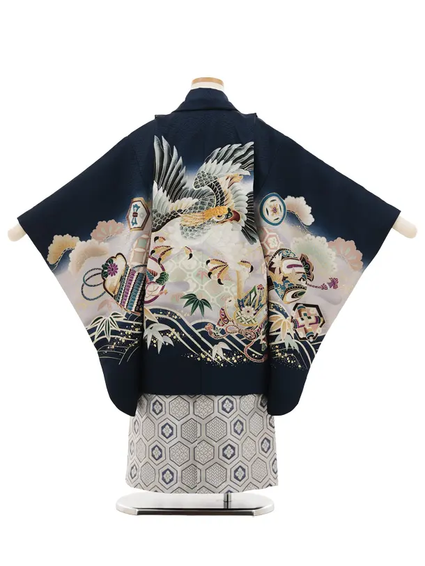 七五三(5歳男袴)X649【正絹】紺地 波に鷹×シルバー