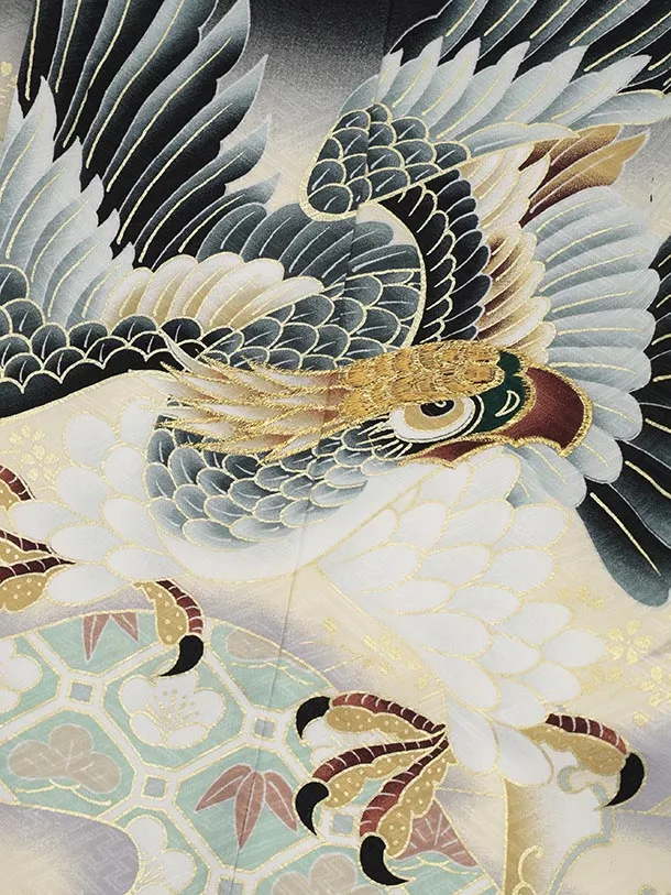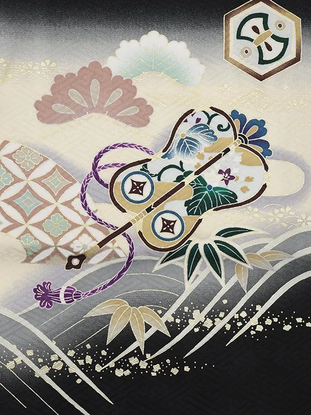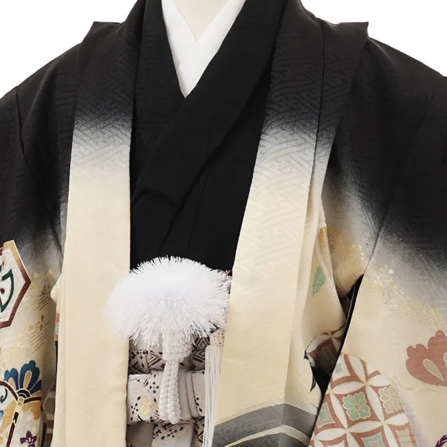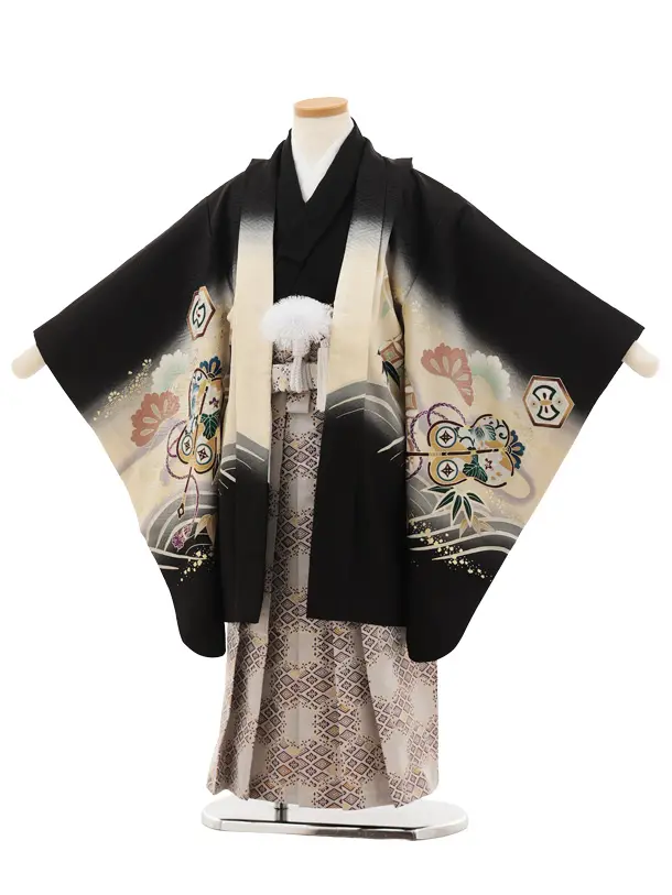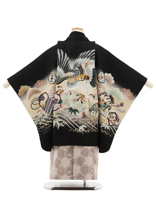 七五三(5歳男袴)X653【正絹】黒地 波に鷹×白菱