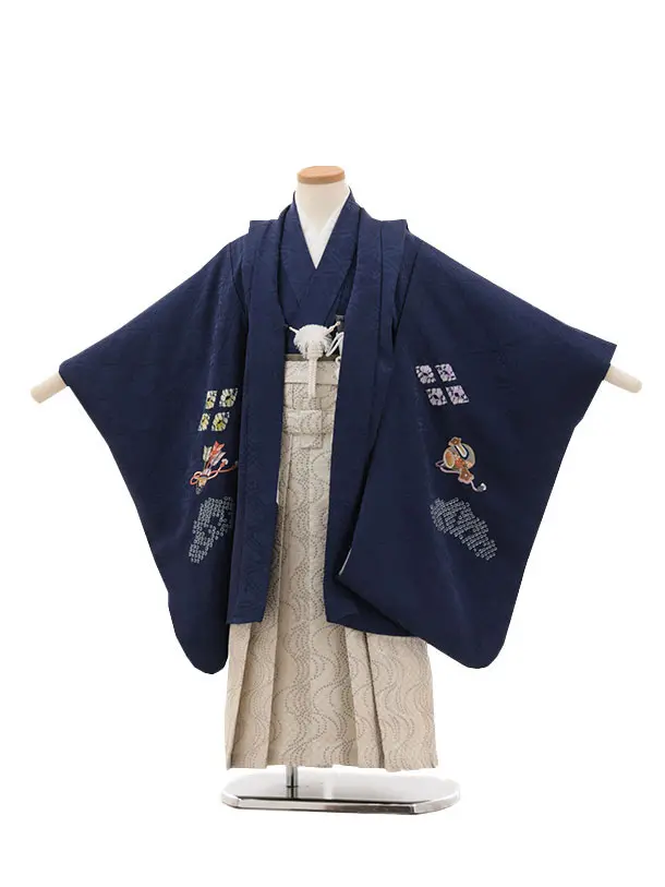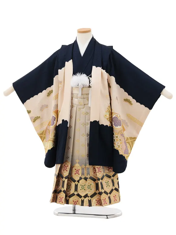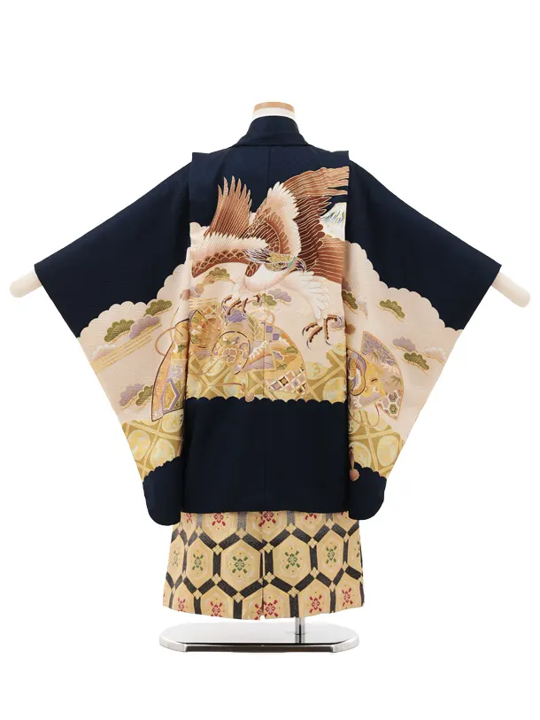 かんたん七五三(5歳男袴)X702【正絹】 紺地 扇絵 鷹×ゴールド亀甲