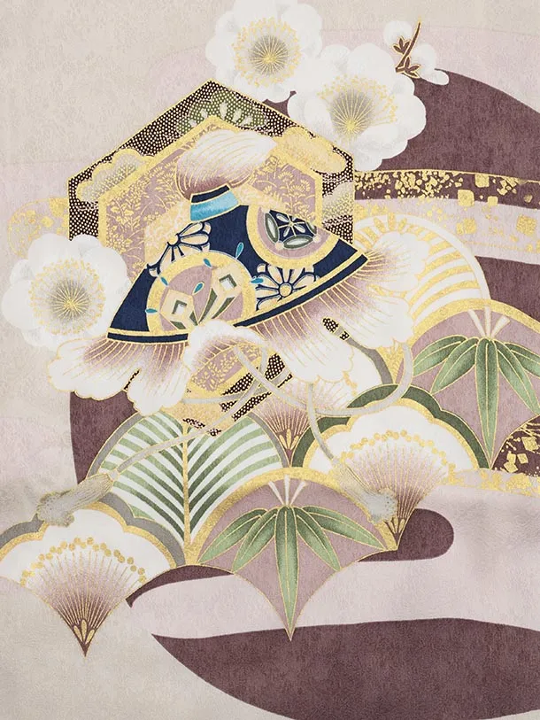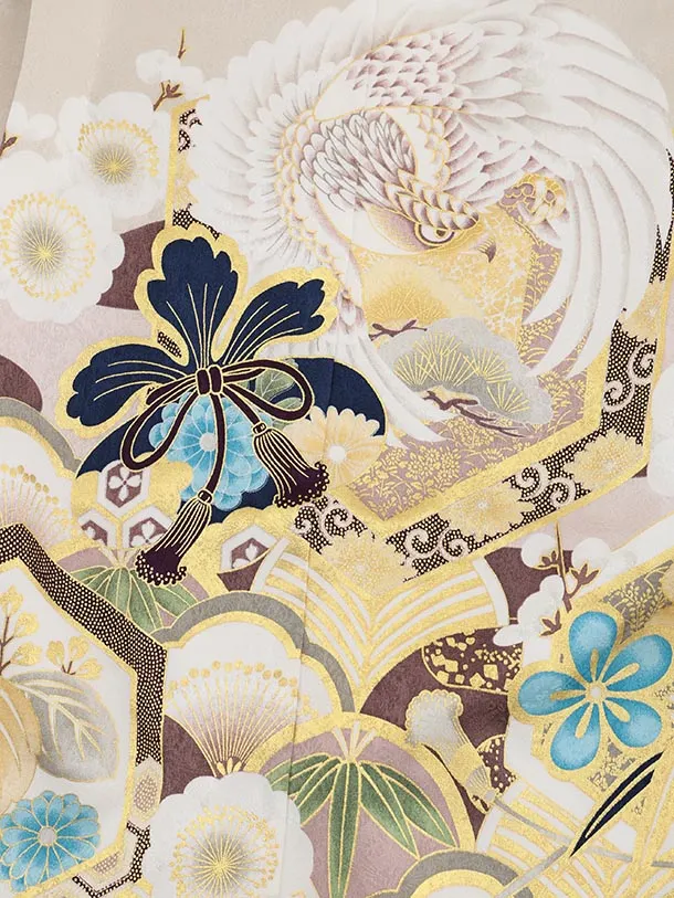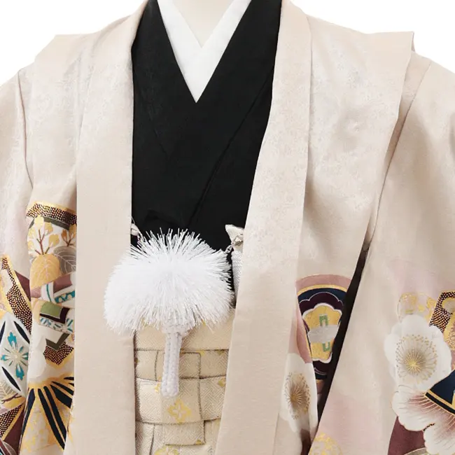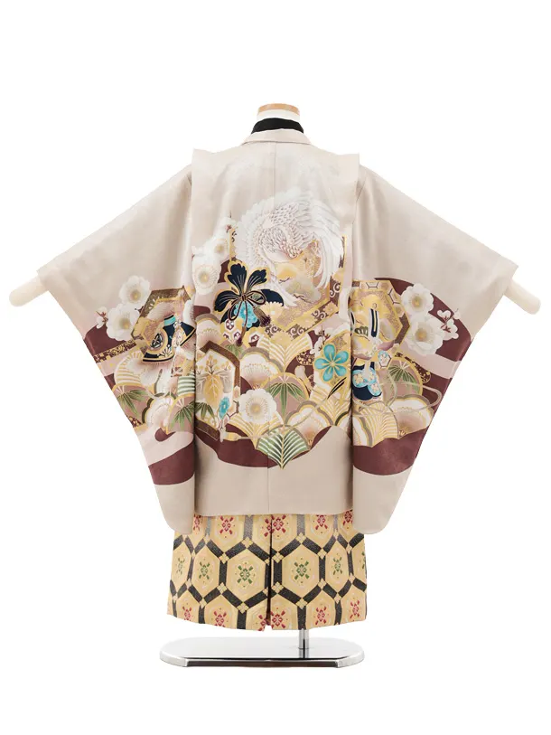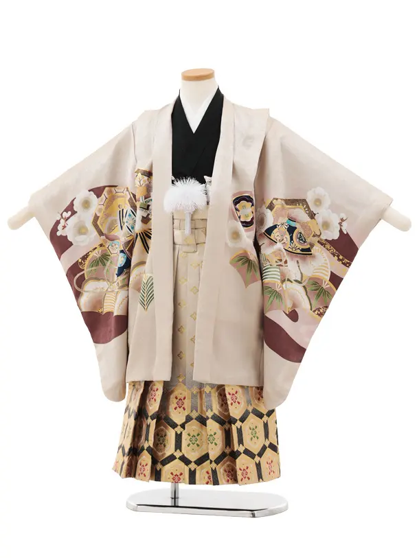 かんたん七五三(5歳男袴)X703【正絹】 ベージュ吉祥文様 白鷹×ゴールド亀甲