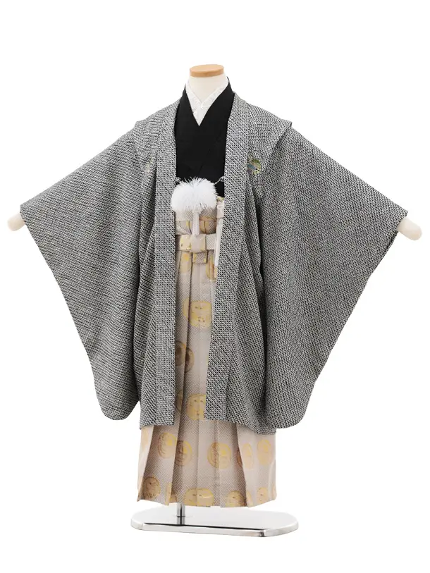 七五三(5歳男袴)X713【高級正絹】黒地絞り刺繍紋×ベージュ丸紋