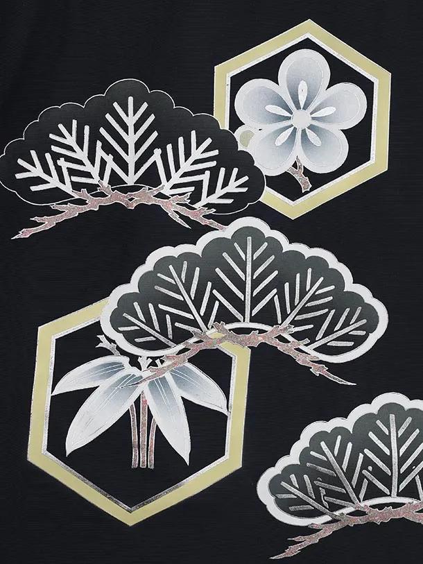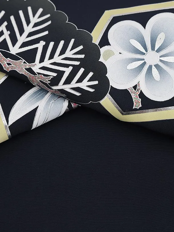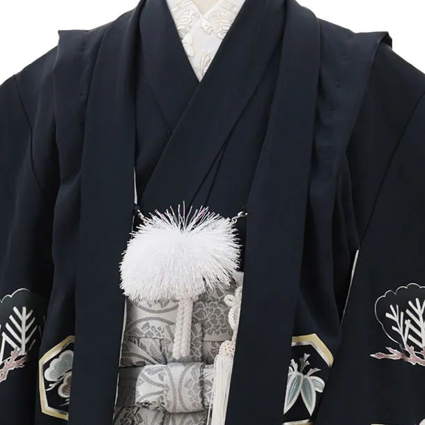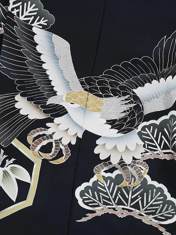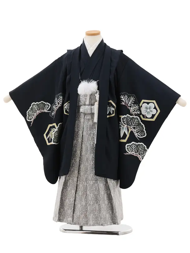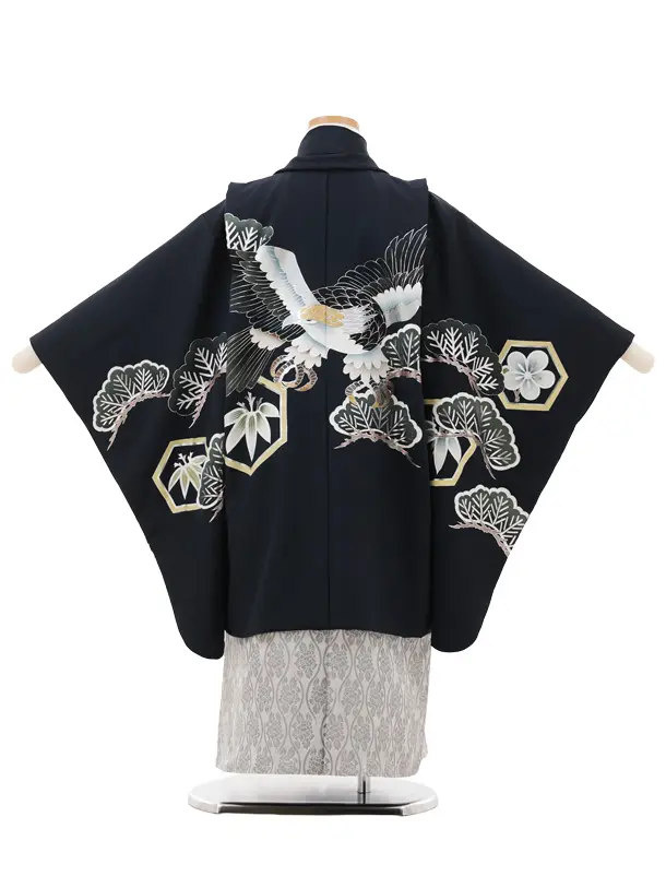 七五三(5歳男袴)X714【高級正絹】紺地 松竹梅に鷹×グレー