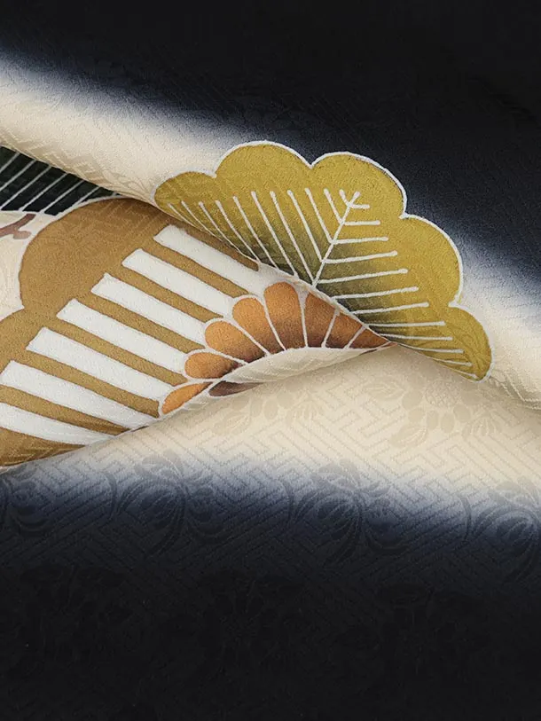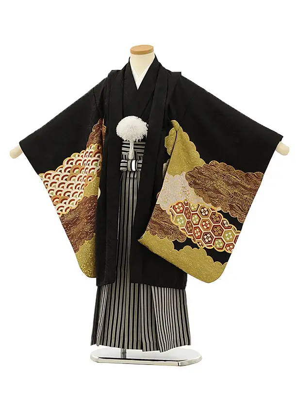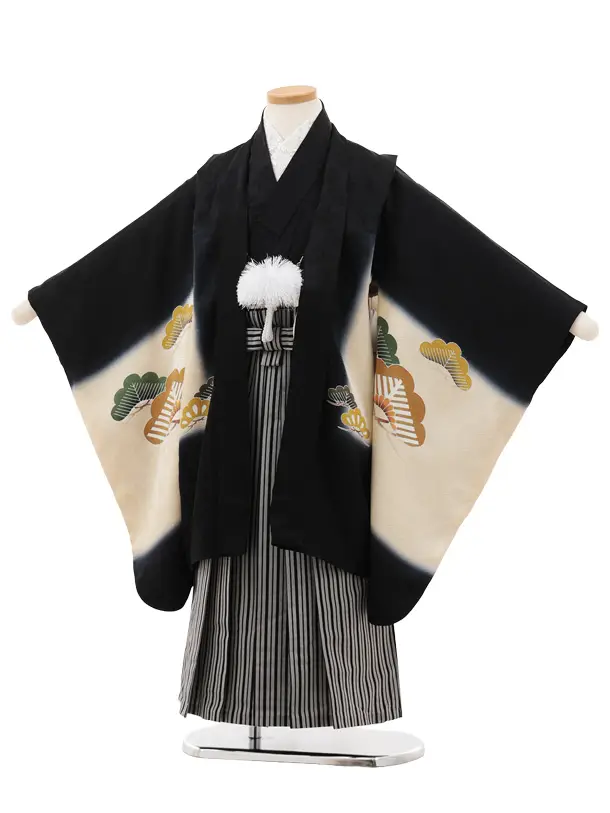 七五三(5歳男袴)X724【高級正絹】黒地 松に吉祥文様 鷹×黒縞