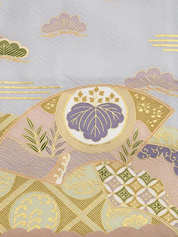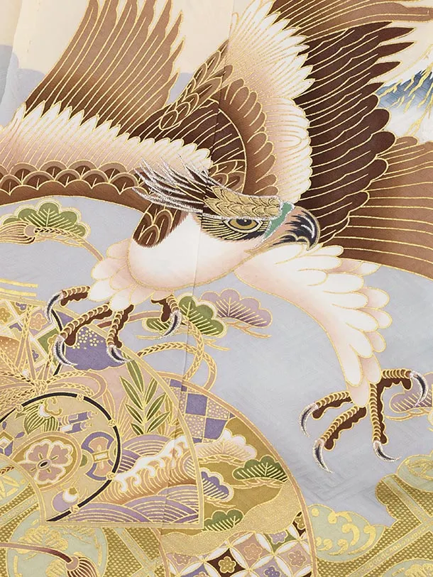 七五三(5歳男袴)X730【正絹】クリームベージュ鼓に鷹×グレー