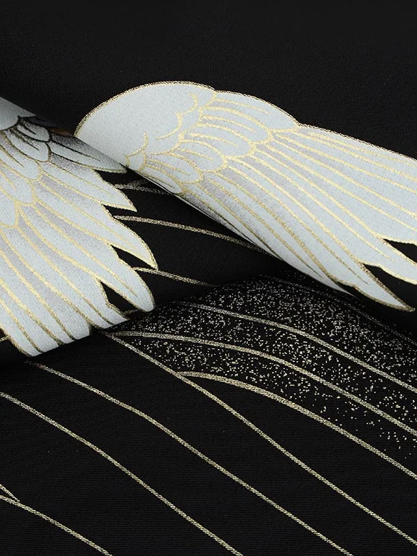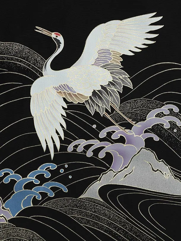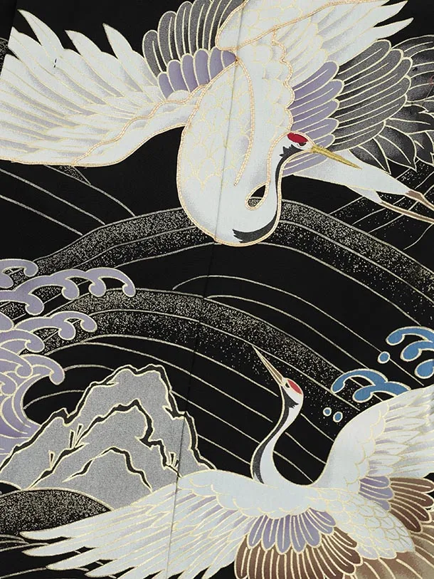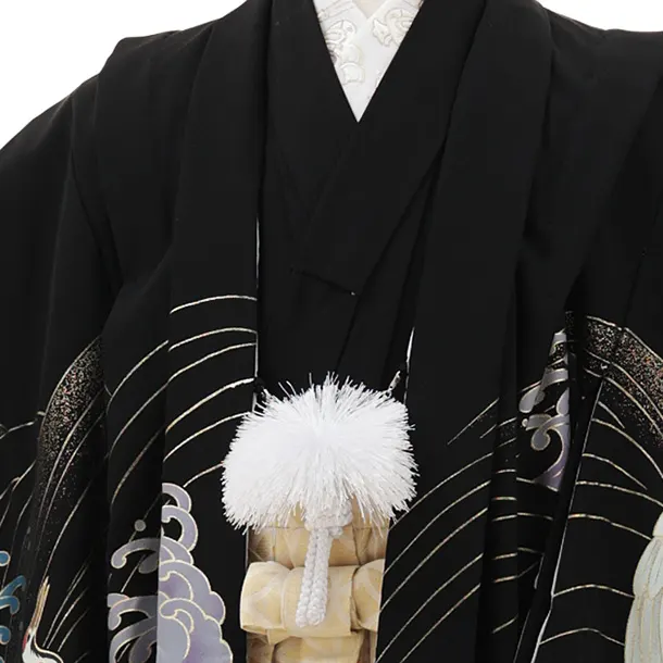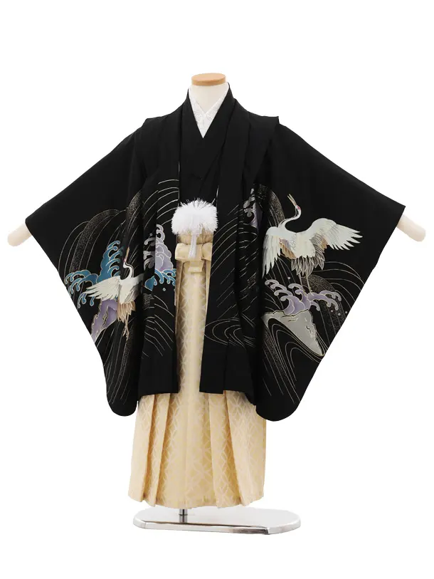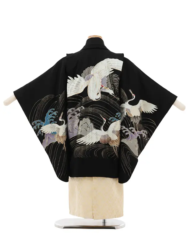 七五三(5歳男袴)X731【正絹】黒地 波に鶴×ゴールド