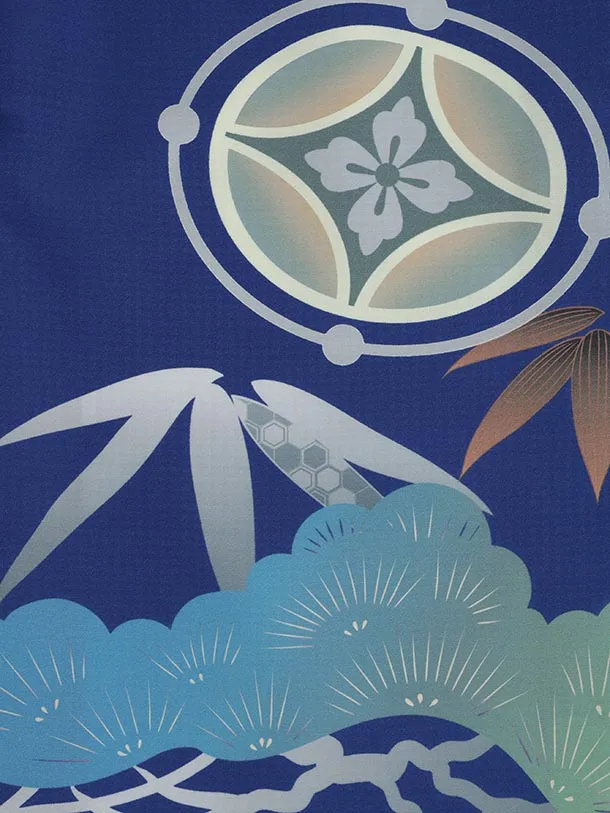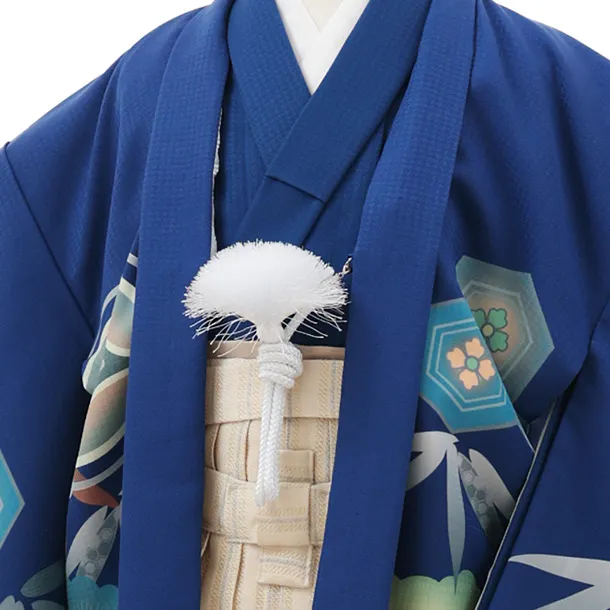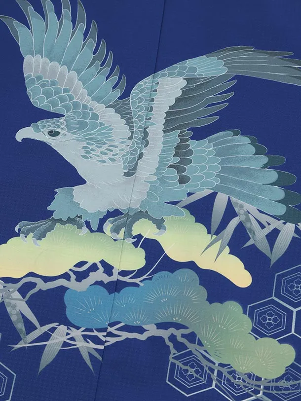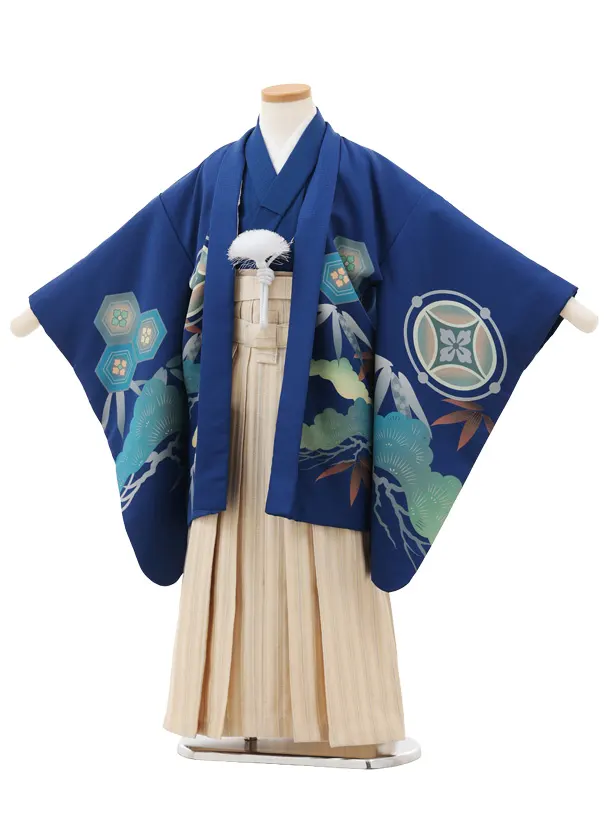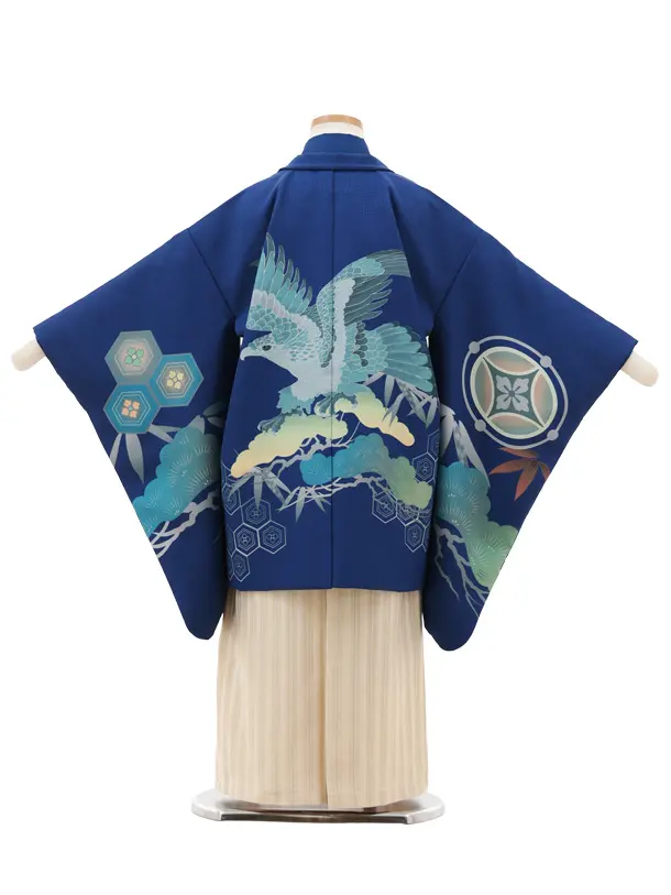 かんたん七五三(5歳男袴)X751 ブルー地 松に鷹×アイボリーストライプ