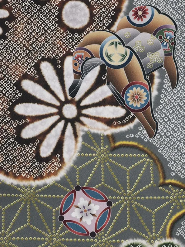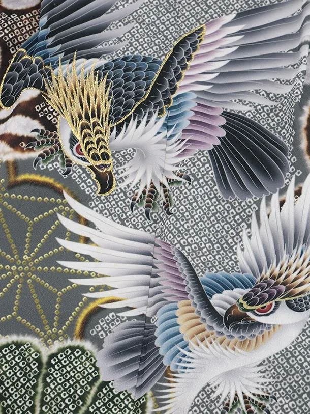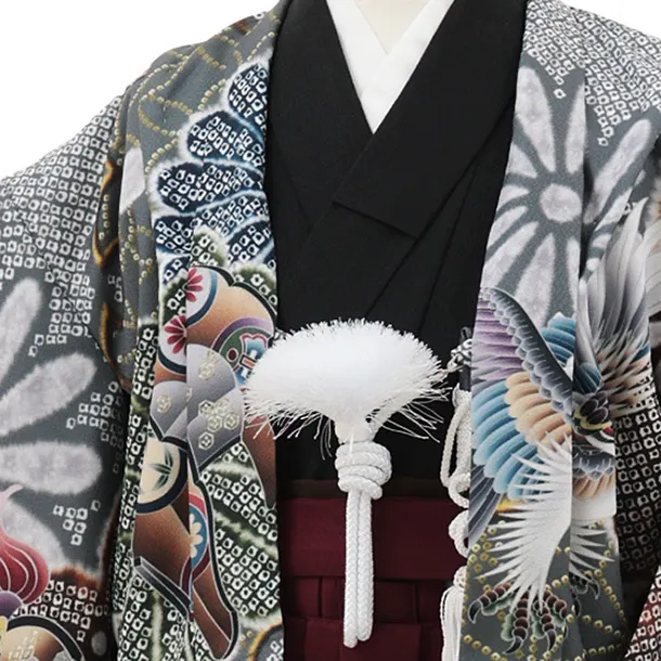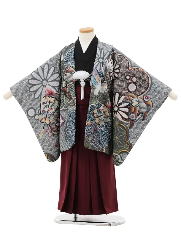かんたん七五三(5歳男袴)X782 グレー疋田柄 吉祥文様鷹×ボルドー