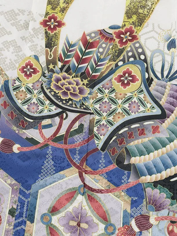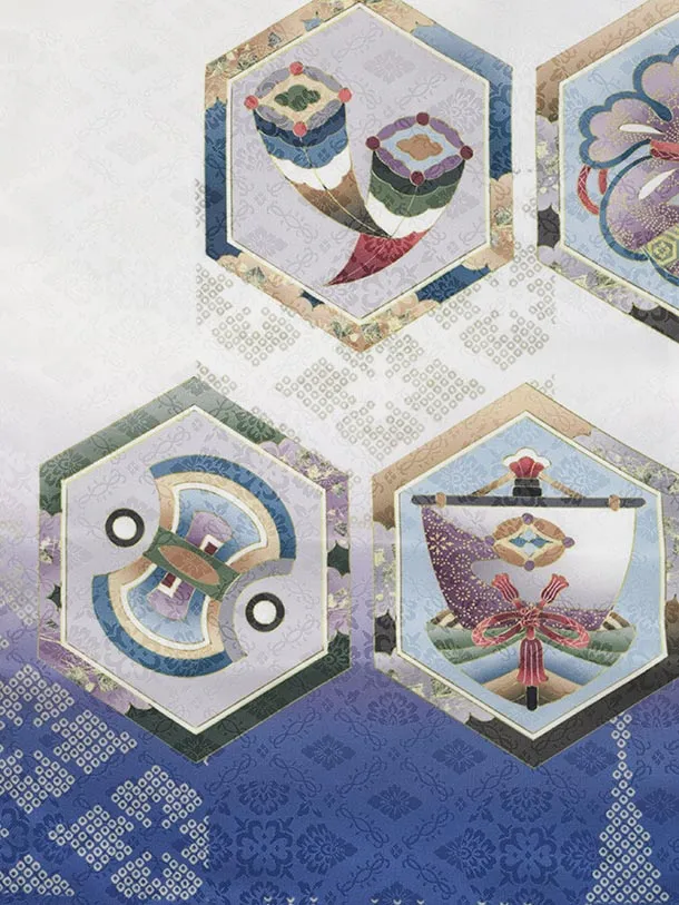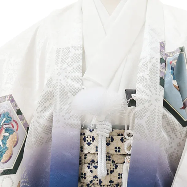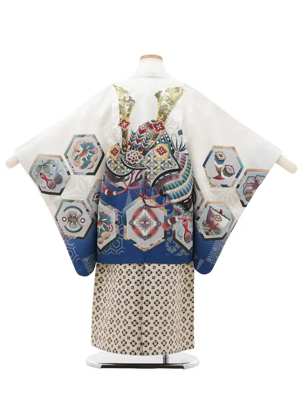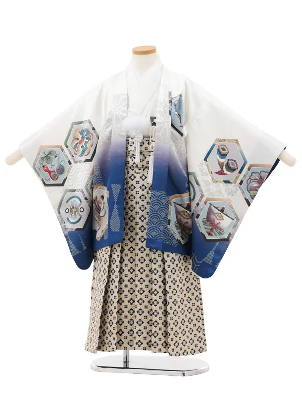 かんたん七五三(5歳男袴)X785 白ブルーぼかし 亀甲紋に兜×ベージュ